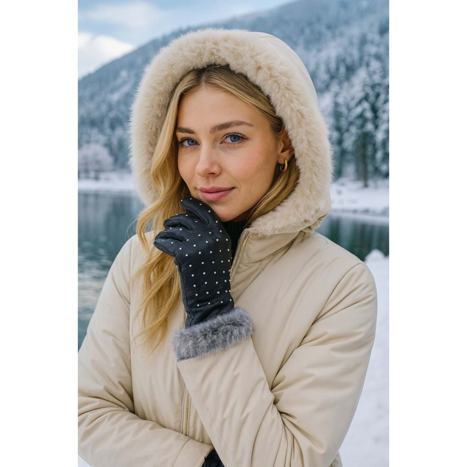 Bileği Kürklü Taşlı Siyah PU PU Deri Eldiven