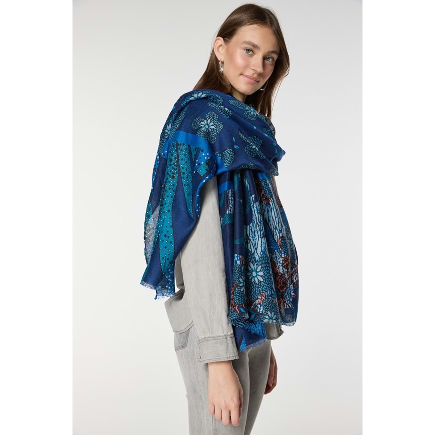 Çiçek Desenli Saks Mavi Şal