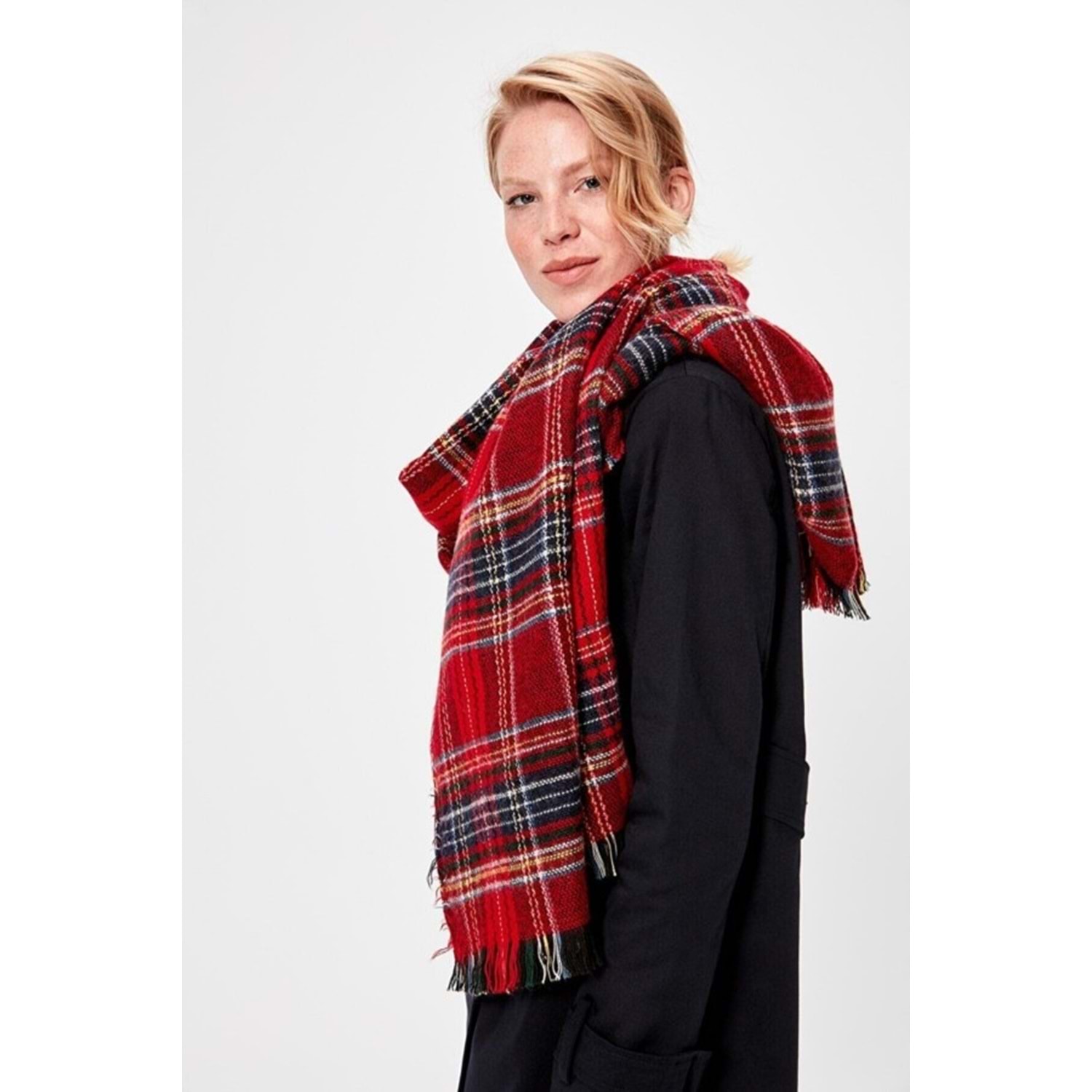 Ekose Desenli Kırmızı Püsküllü Puf Kalın Şal Atkı