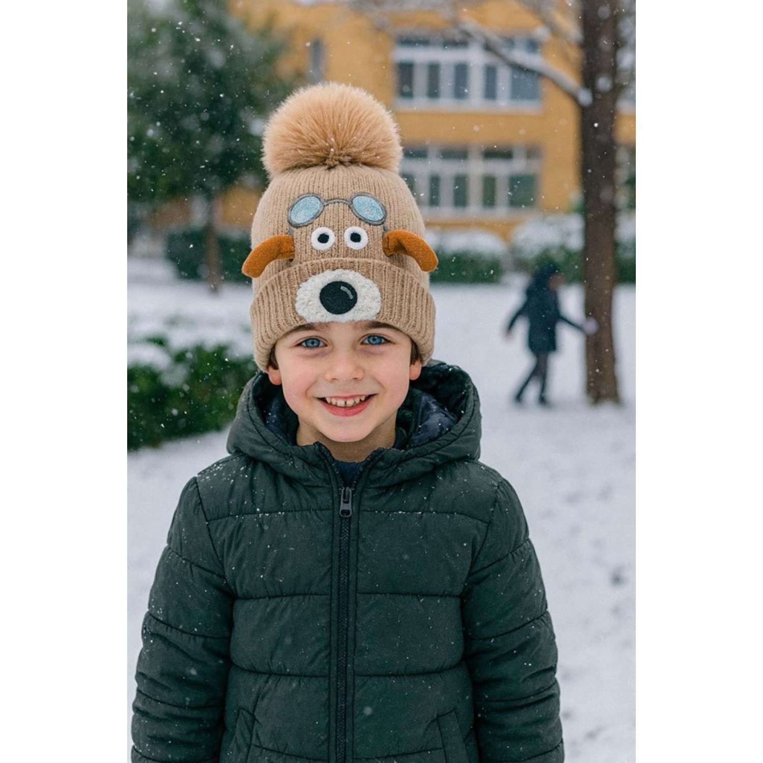 Ponponlu İçi Polarlı Hayvan Desen Nakışlı Vizon Çocuk Beresi 3-7 Yaş