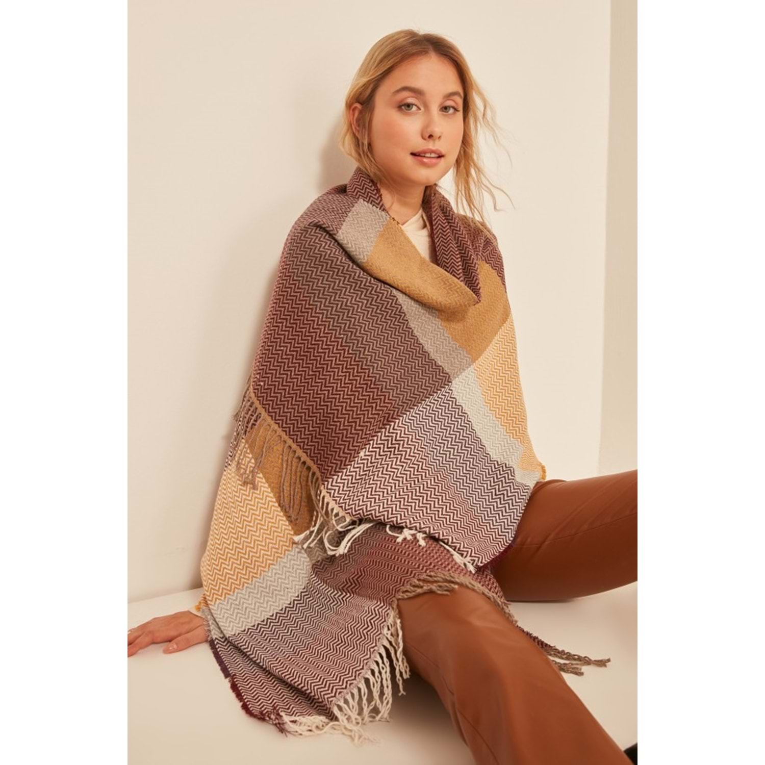 Yumuşak Dokulu Balık Sırtı Desenli Bordo Kalın Omuz Şal Atkı