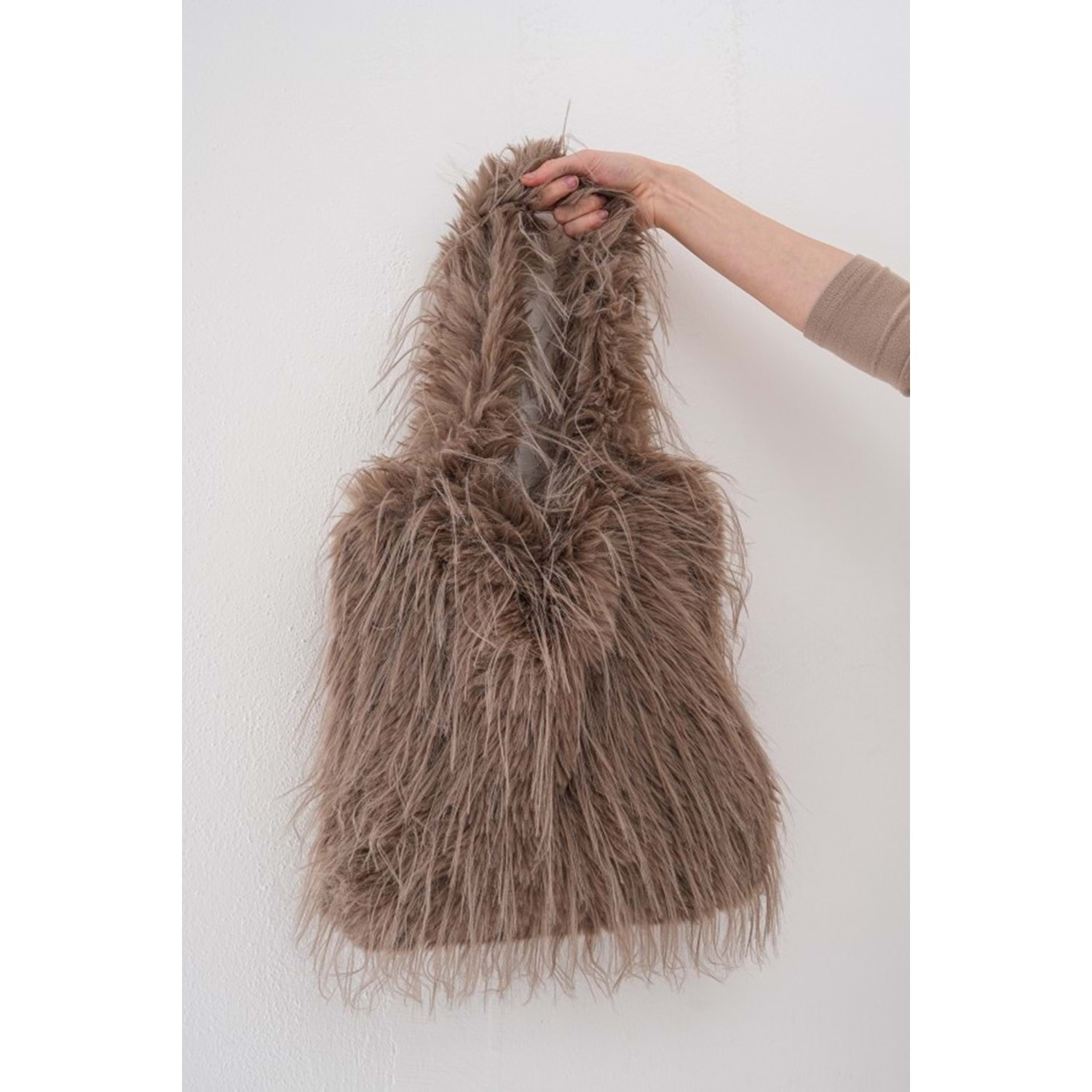 Vizon Renk İtalyan Saçaklı Peluş Çanta Çıtçıt Kapamalı