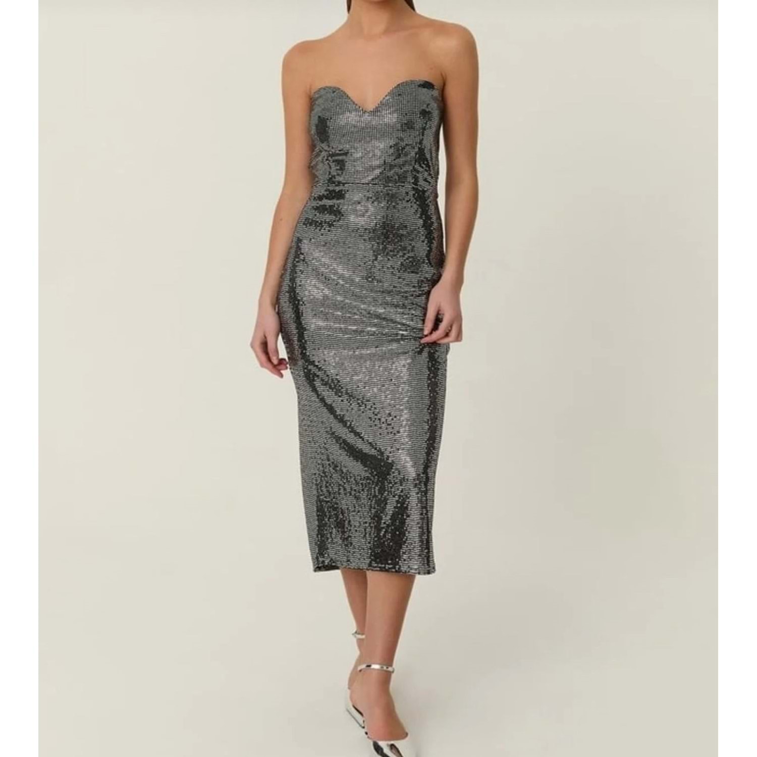 Disco Gümüş Straplez Midi Boy Elbise Party! - GÜMÜŞ - S - ST00553-GÜMÜŞ-S