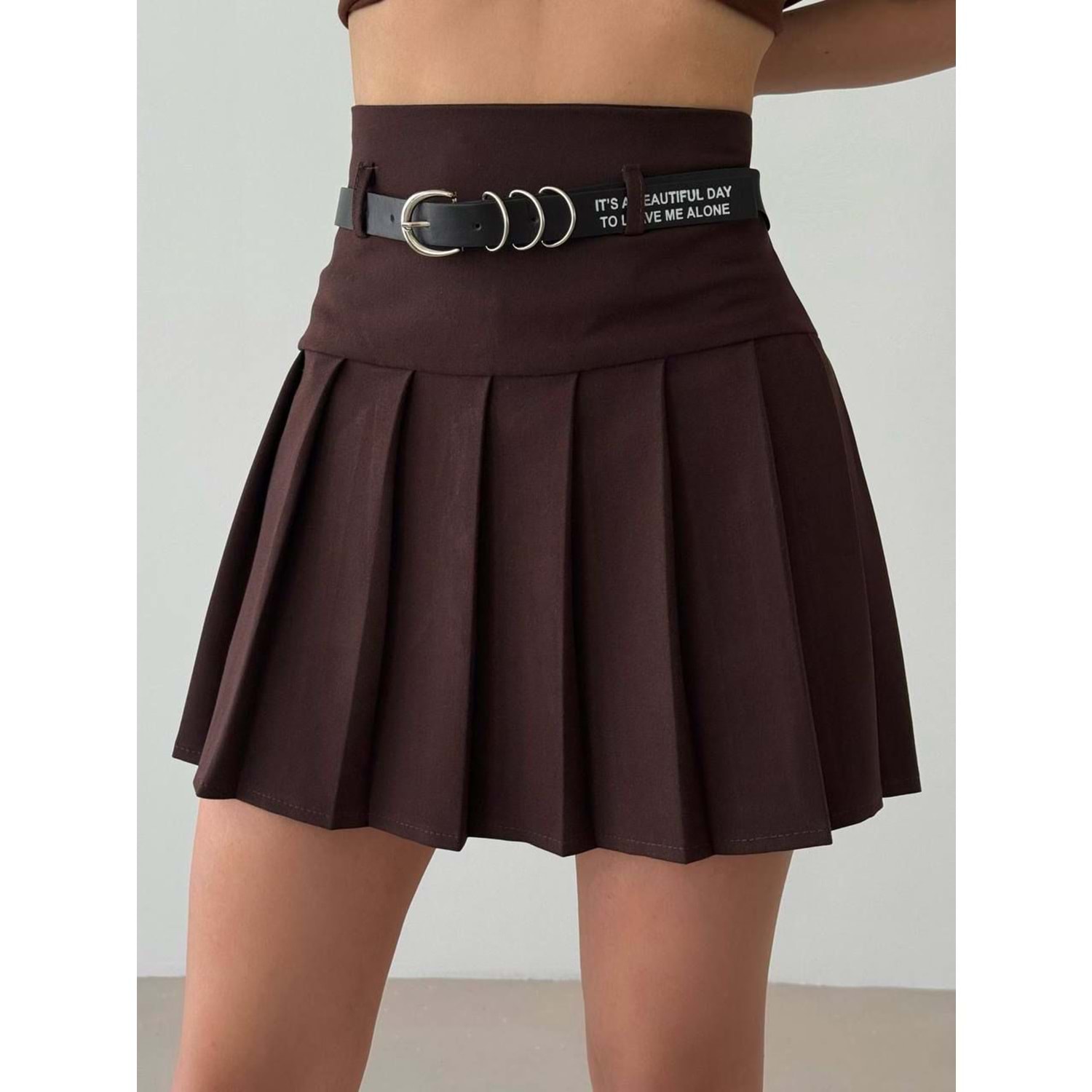 Yazı Detay Kemerli Piliseli Mini Etek Kahverengi Premium Duruş - KAHVERENGİ - L