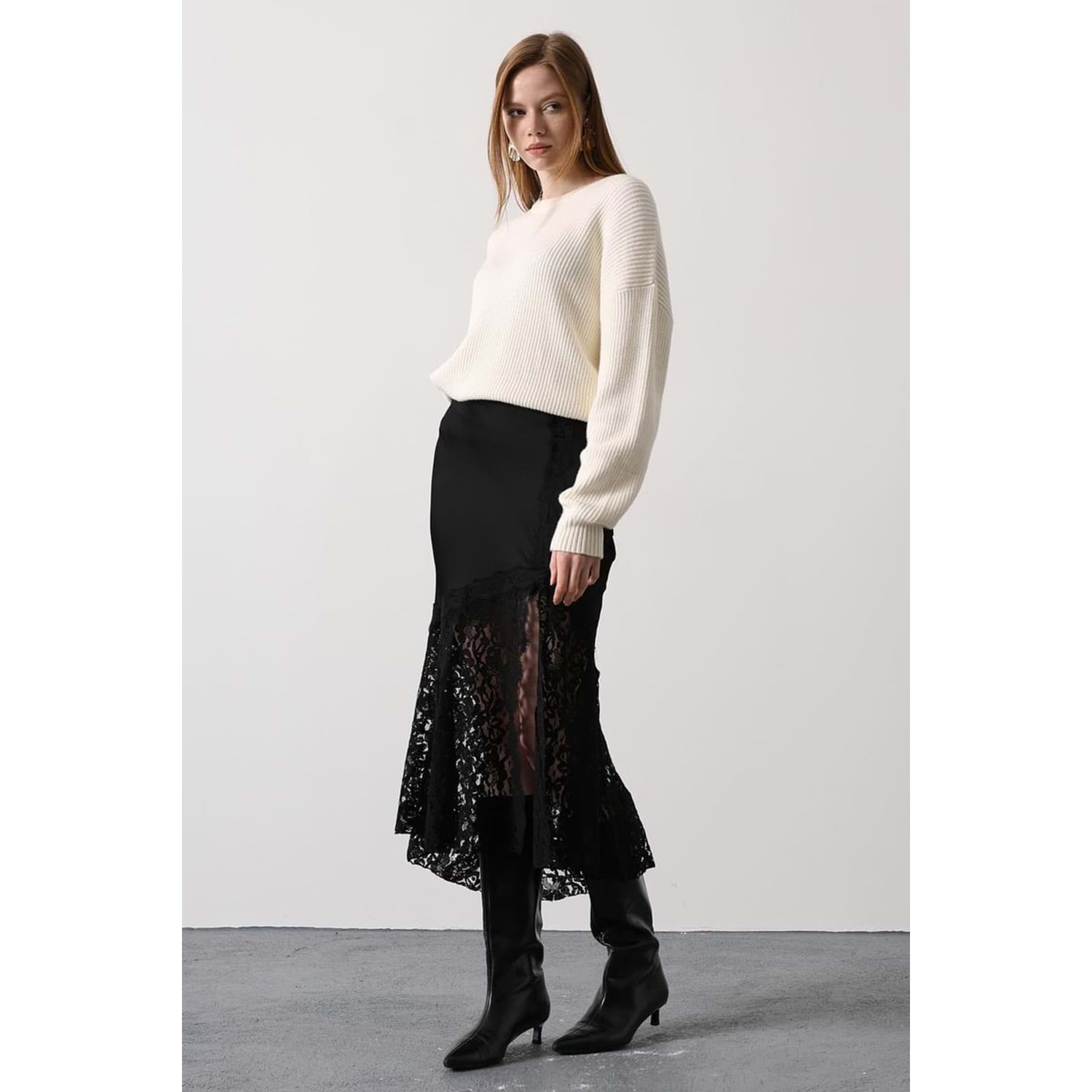 Yeni Sezon Dantelli Saten Etek Siyah Renk - Bel Fermuar Kapamalı - L