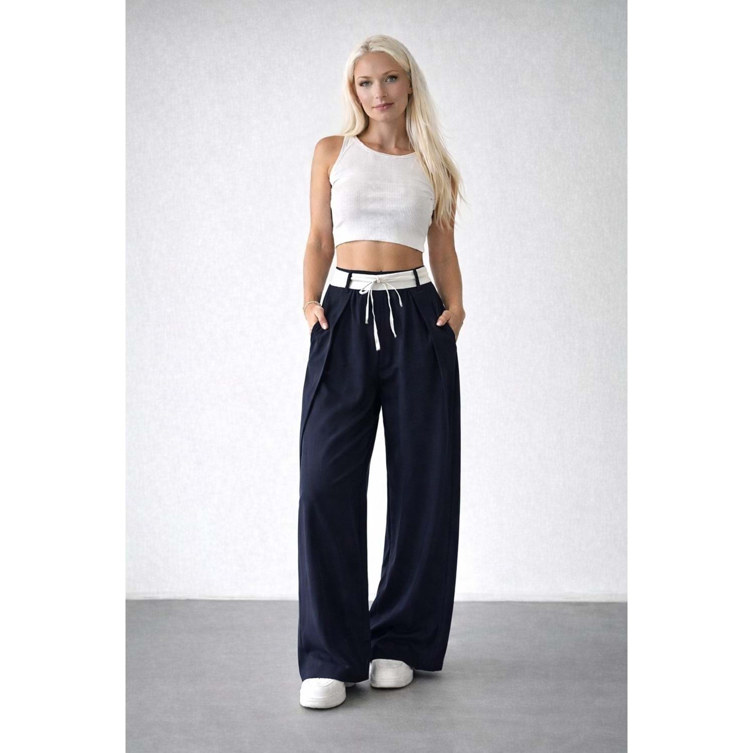 Bel Detaylı Tasarım Palazzo Pantolon - LACİVERT - L
