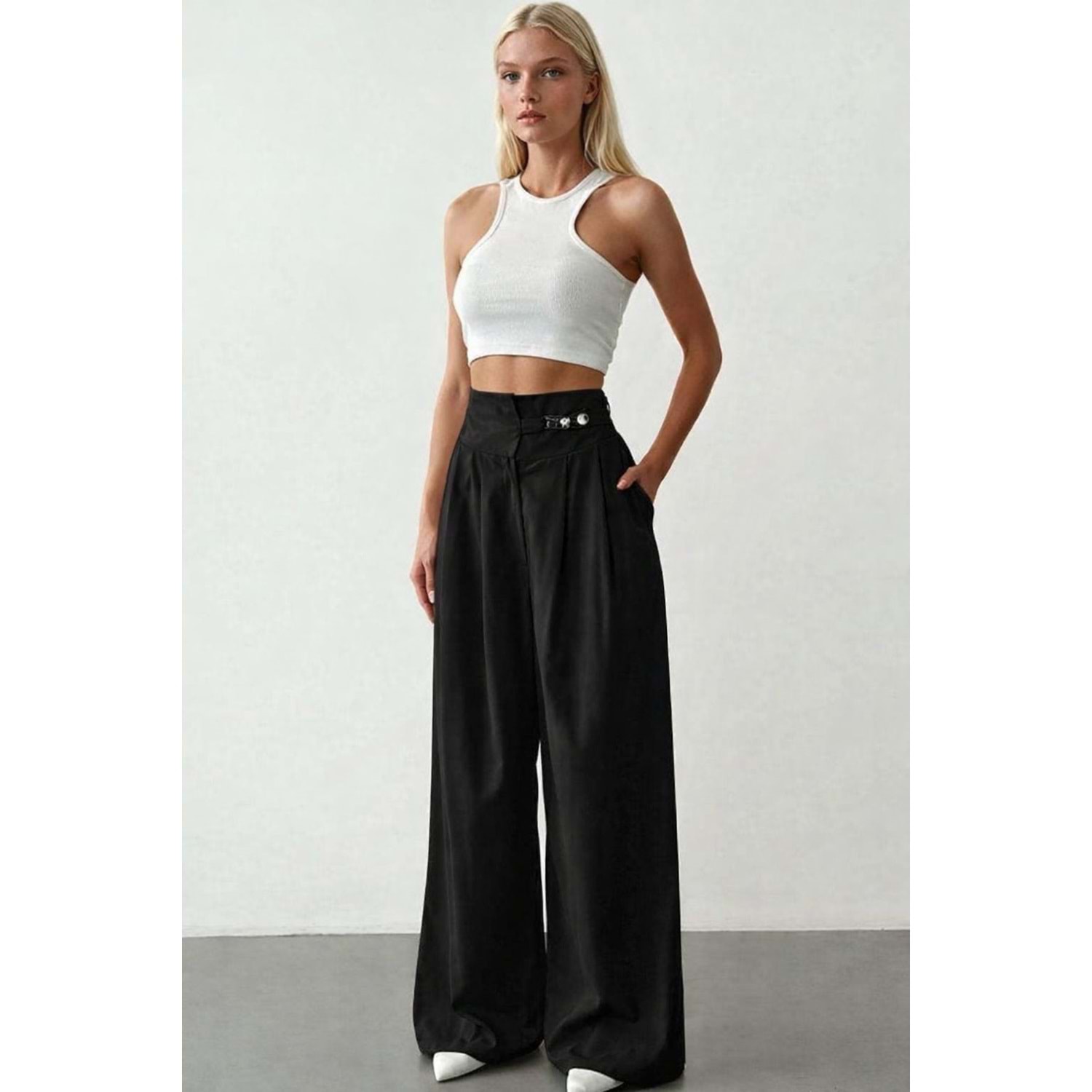Bol Paça siyah Renk Yüksek Bel Palazzo Pantolon Toka Detaylı - SİYAH - M