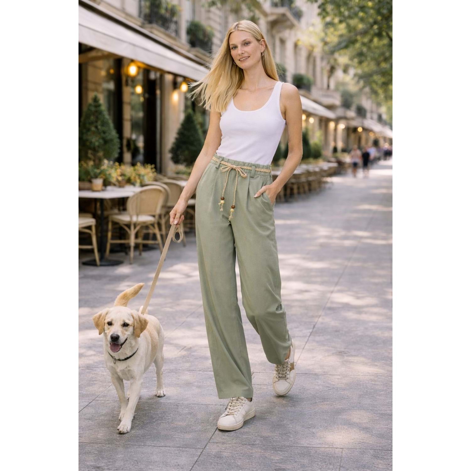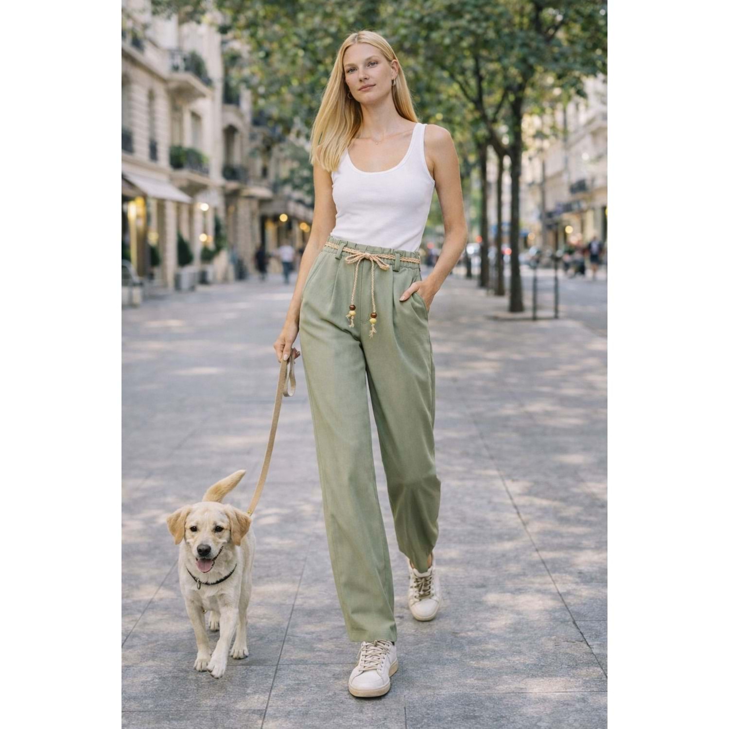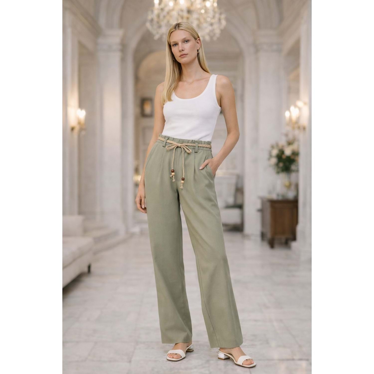 Natural Flow Bağcıklı Salaş Pantolon Keten Pamuk - Yağ Yeşili - YEŞİL - L