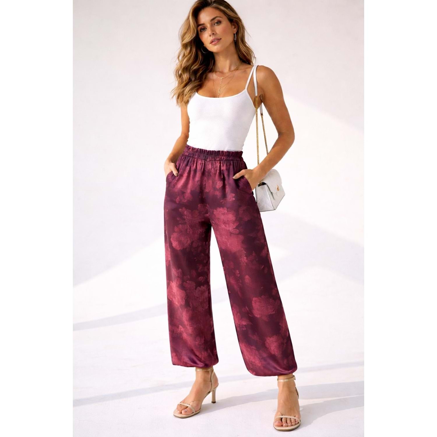 Saten Kumaş Paça Lastikli Şalvar Pantolon Premium Kalite - BORDO - L