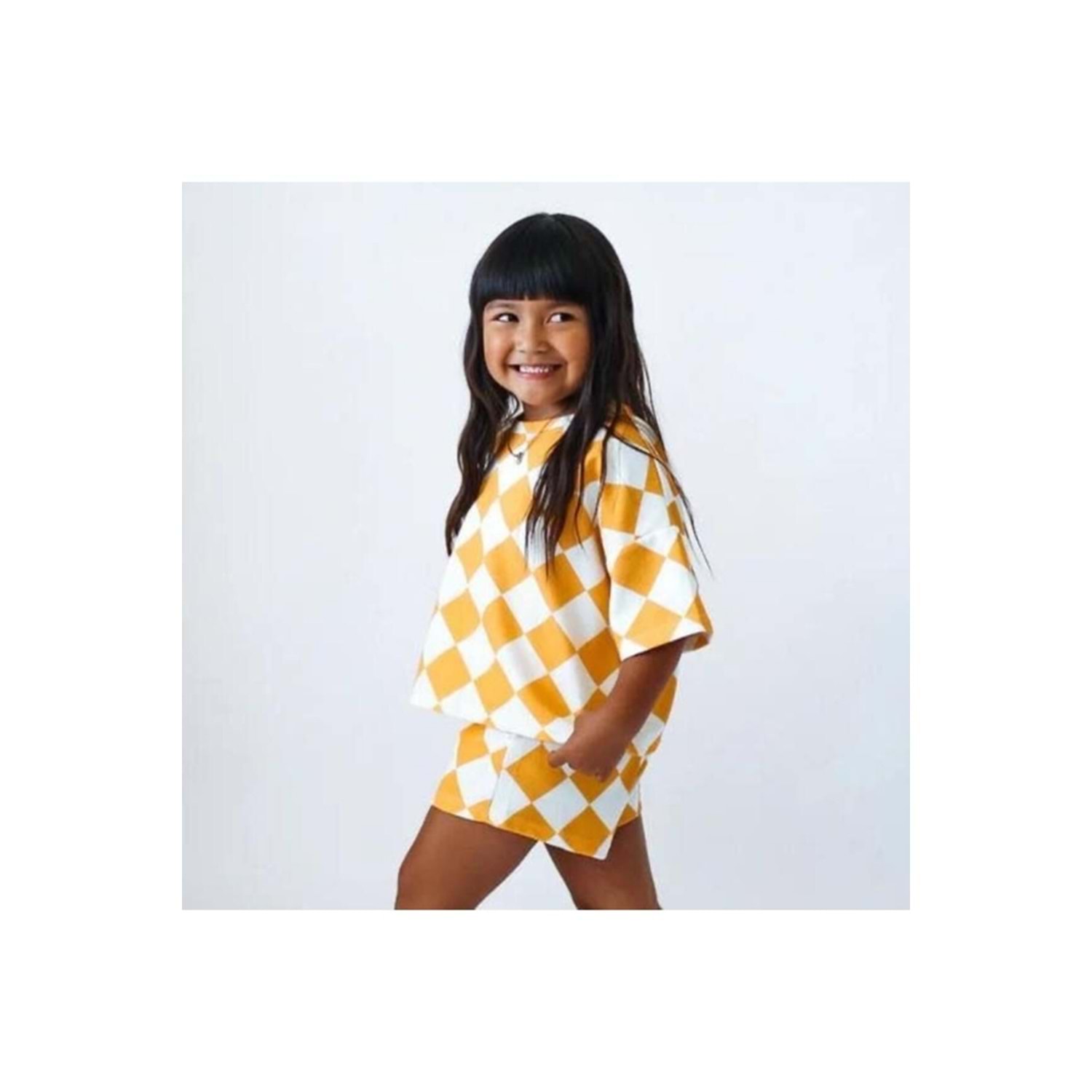 Kız Çocuk Oversize Ekose - Dama Desenli Tişört ve Şort 2li Takım – 2-7 Yaş Yazlık Takım Sarı Renk
