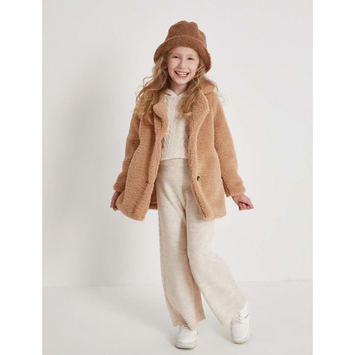 Kız Çocuk Yeni Sezon Trend Peluş Kürk Kaban Düğme Kapamalı Saten İç Astarlı