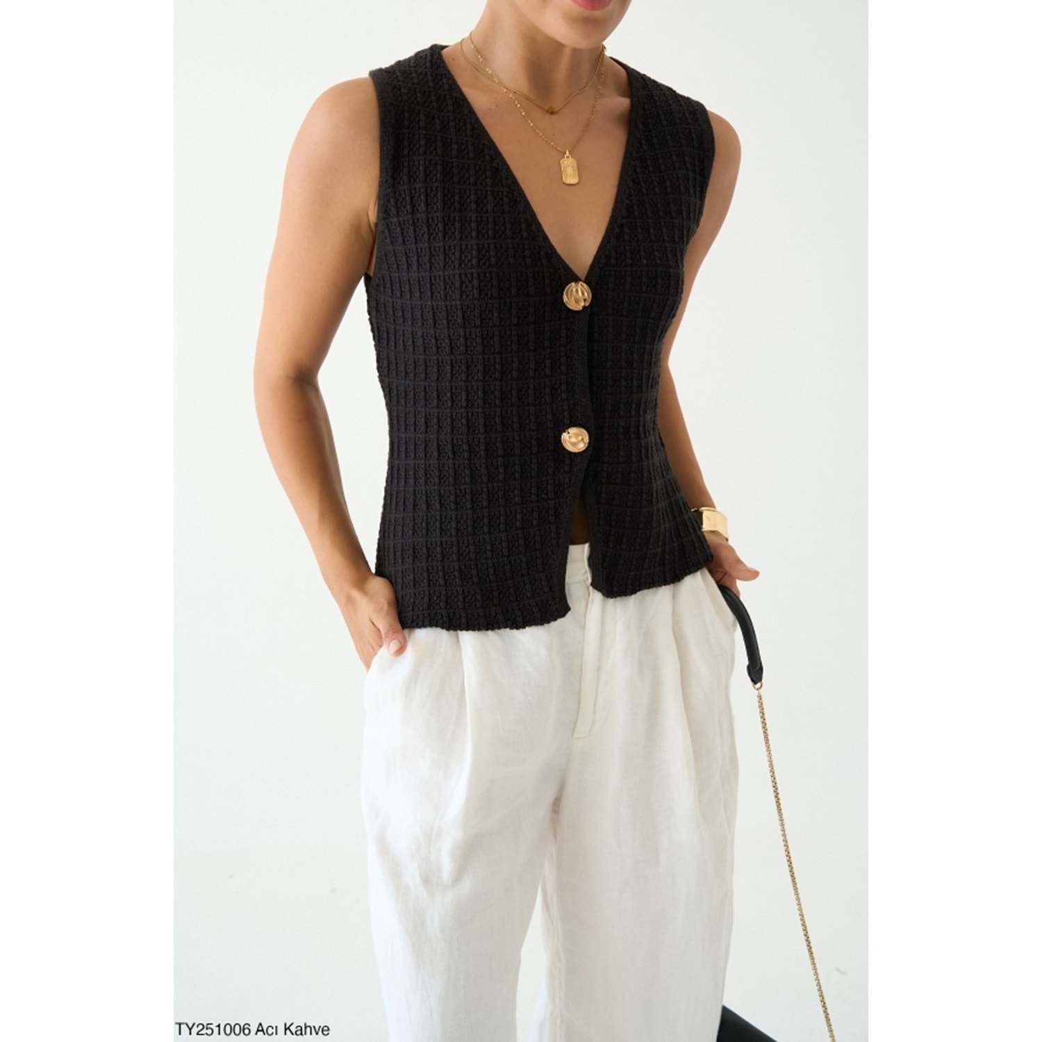Kadın Giyim Aci Kahve Gold Düğme Kapamalı Yelek Yeni Sezon Doku Detaylı