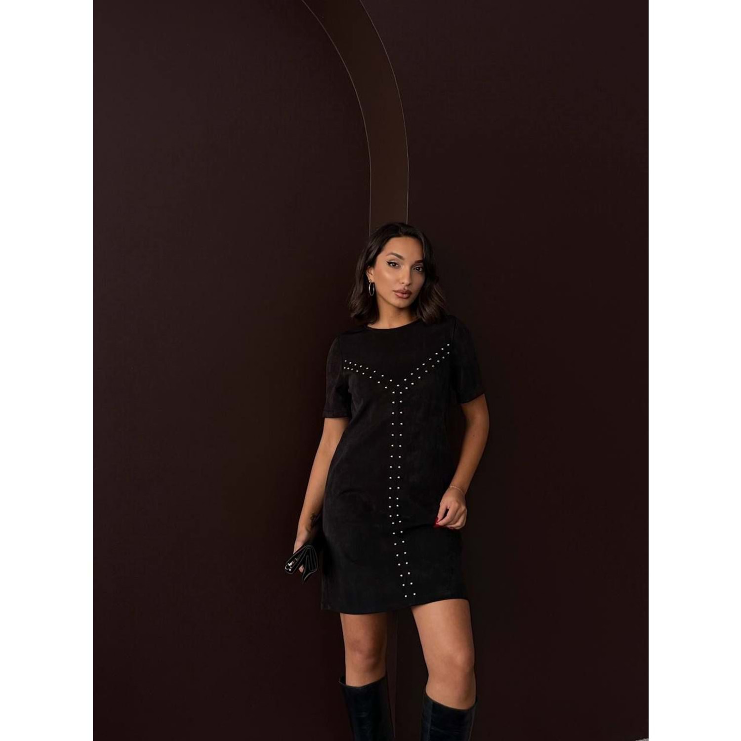 Süet Zımba Detaylı Mini Elbise