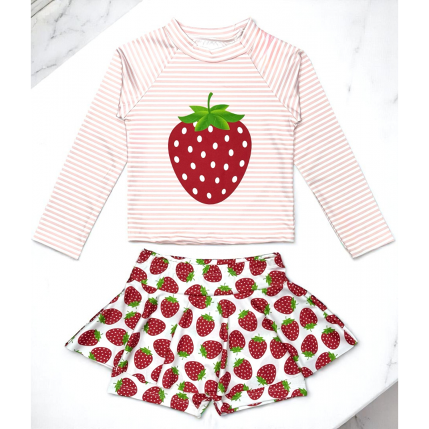Kız Çocuk Çilek Desenli Uzun Kollu Tayt Etekli 2 Parça Mayo / Bikini Takımı