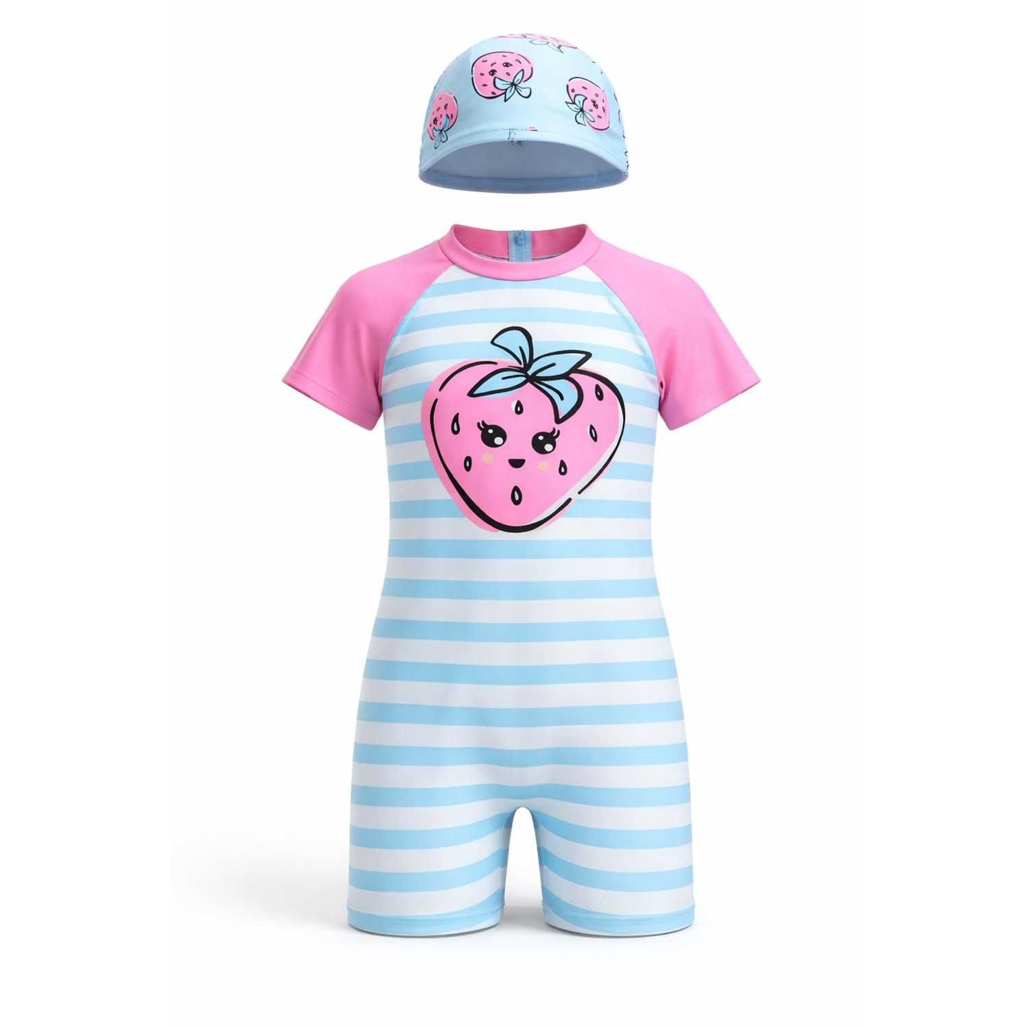 Kız Çocuk Yeni Sezon Mini Çilek Plaj Mayo + Bone Set / Takım - PASTEL PEMBE - 2-3 YAŞ