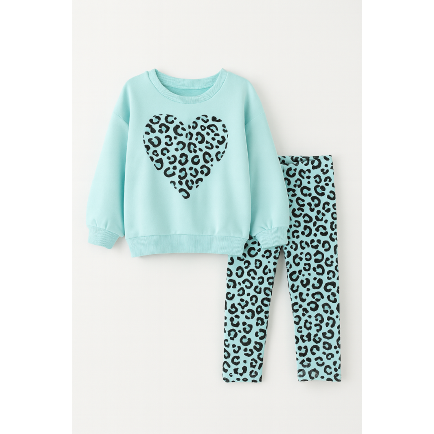 Kız Çocuk Çiçek - Leopar Detaylı 3 İplik Alt Üst Takım Sweatshirt + Tayt