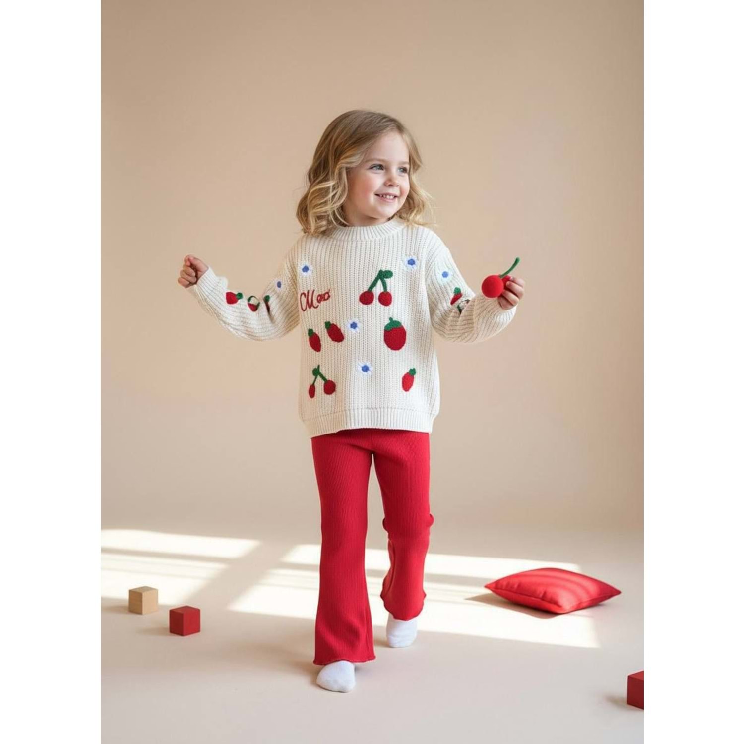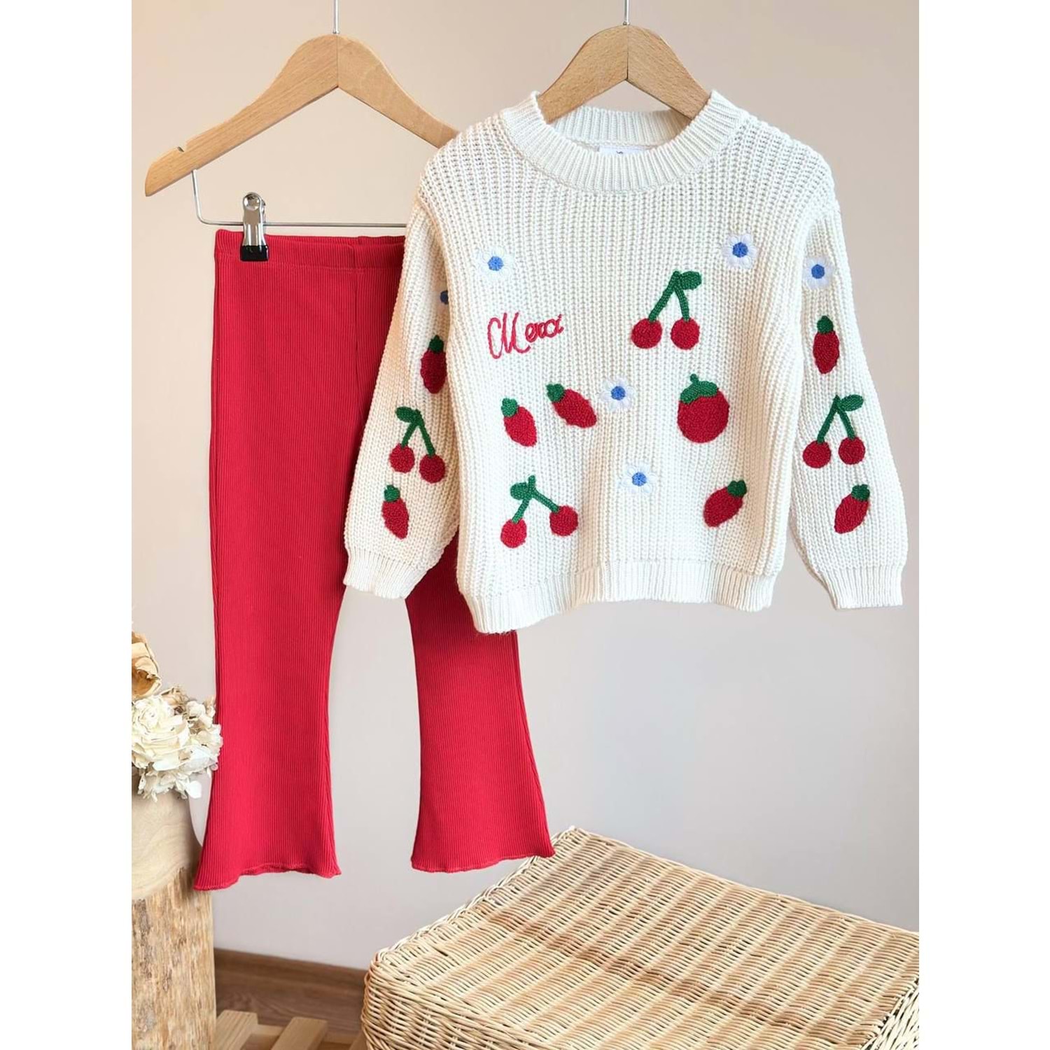 Kız Çocuk Kiraz Nakış Detaylı Alt Üst Takım Set Premium Ürün