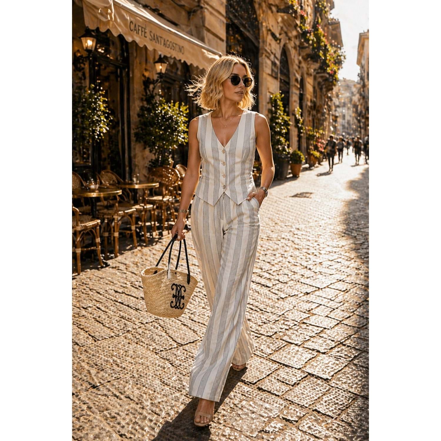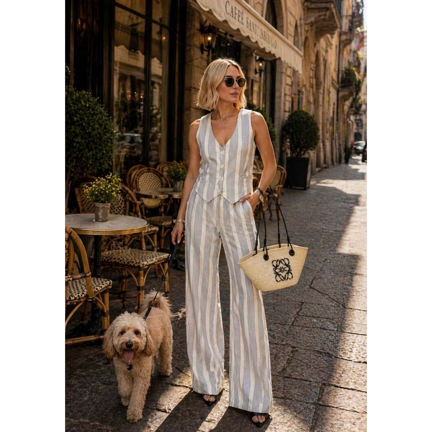Portofino Cizgili Viskon Keten Yelek Pantolon Alt Üst Takım