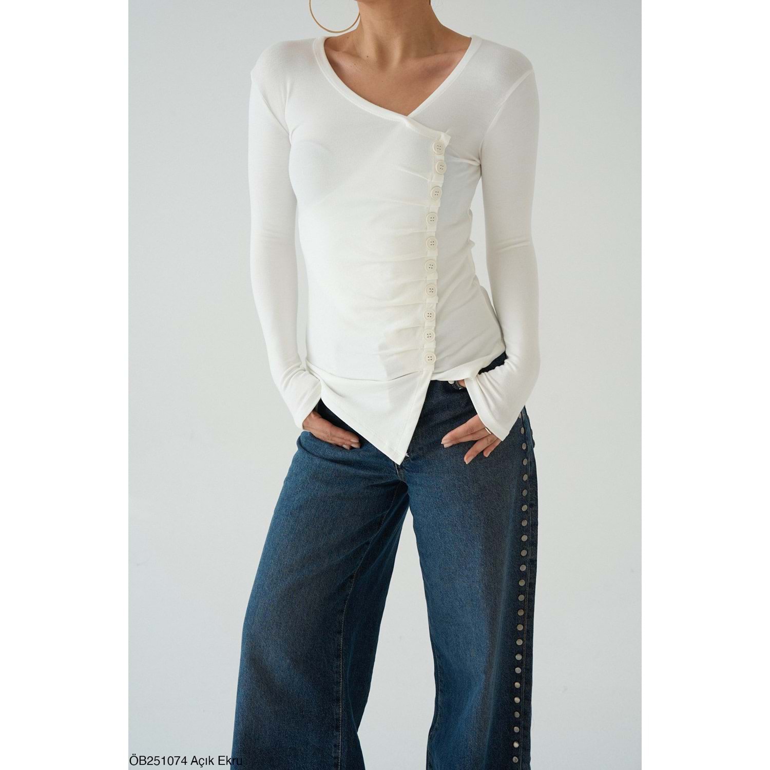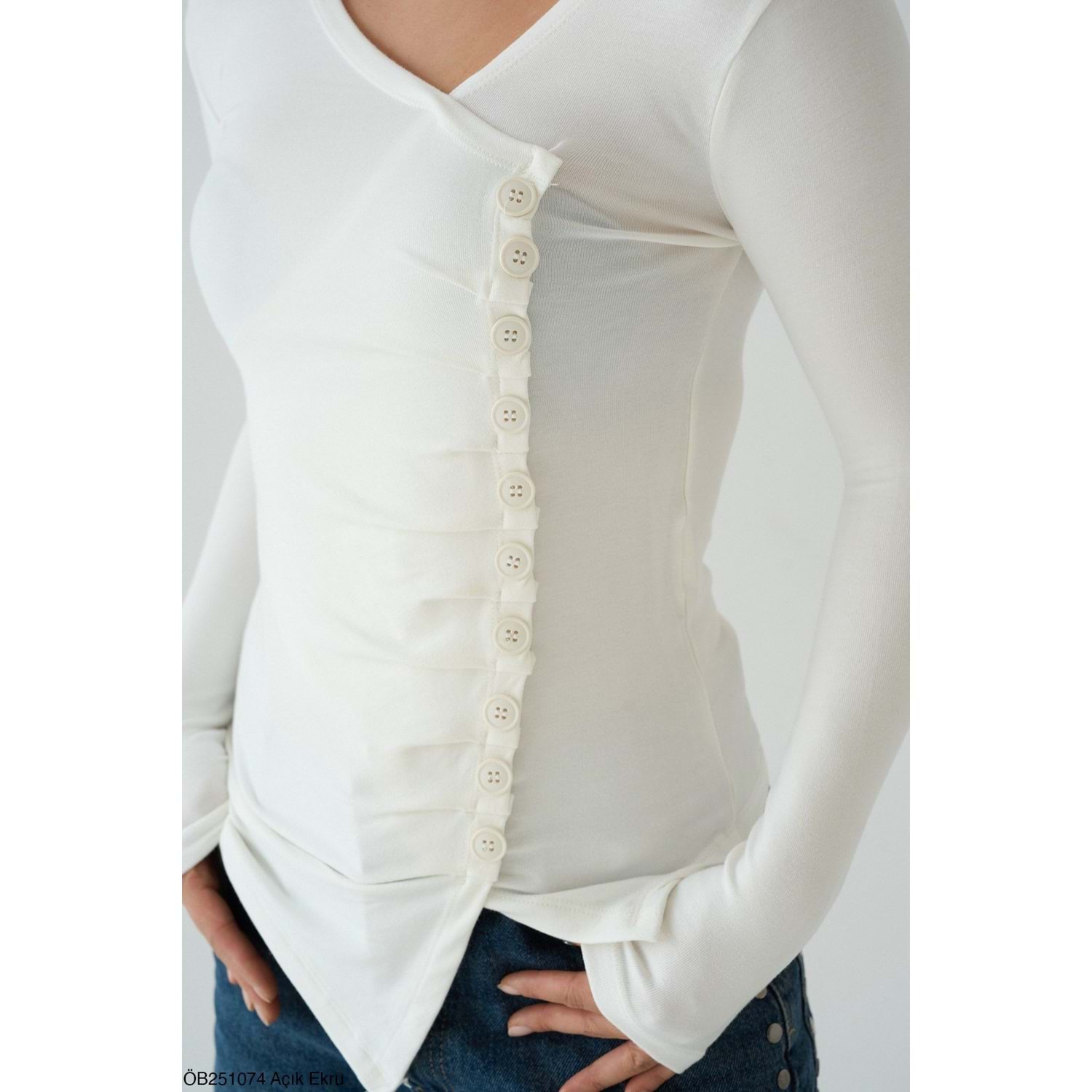 Asimetrik Kesim Yan Düğme Detaylı Tasarım Bluz