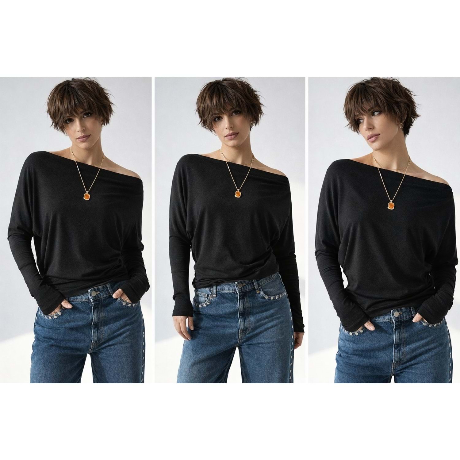 Tek Omuz Düşük Kırçıllı Siyah Bluz - Body