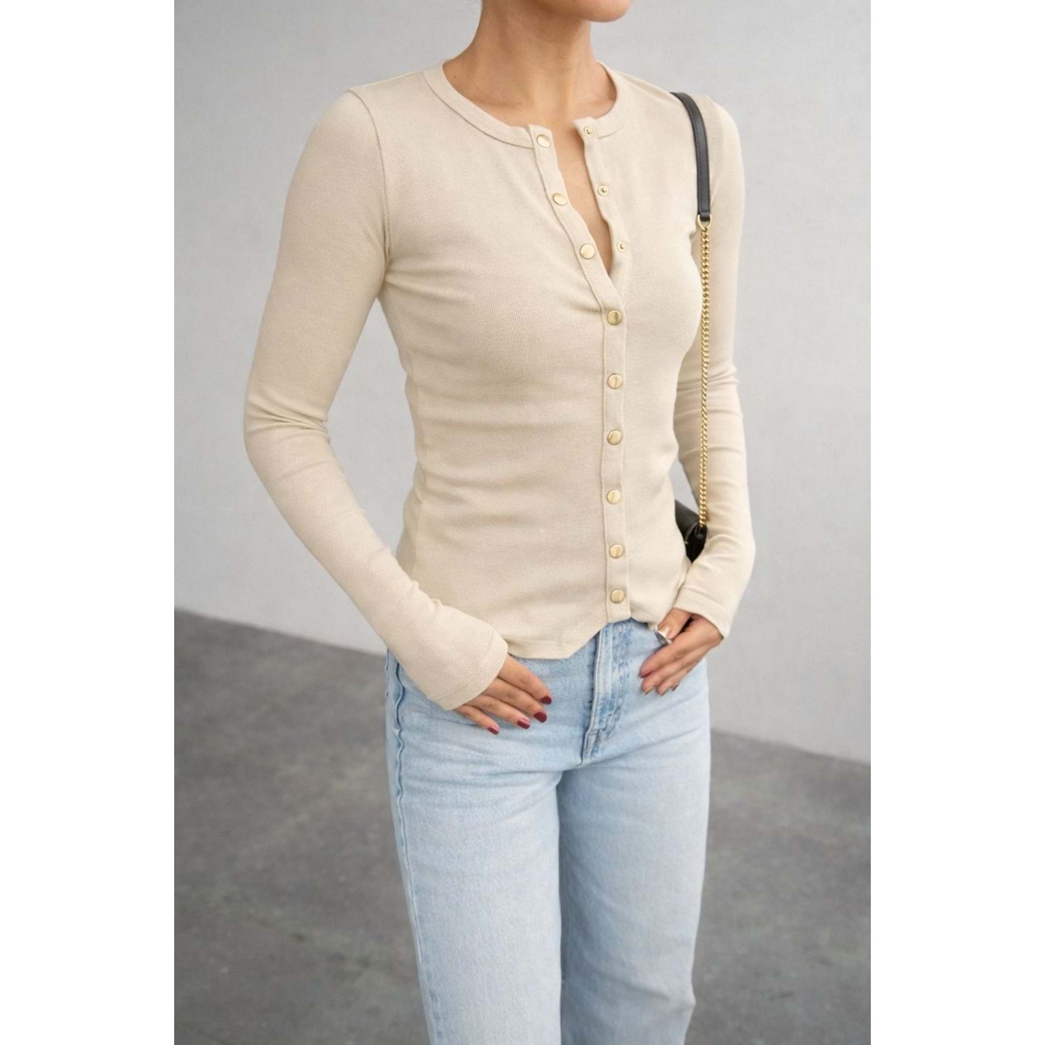 Uzun Kollu Çıtçıt Kapamalı Bluz Gold Detay Krem Renl - KREM - L - ST00641-KREM-L