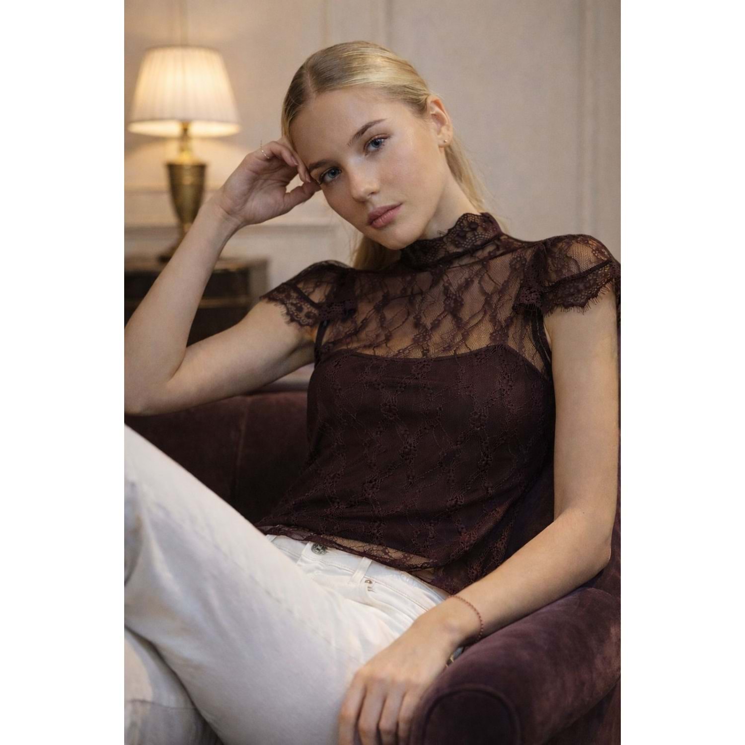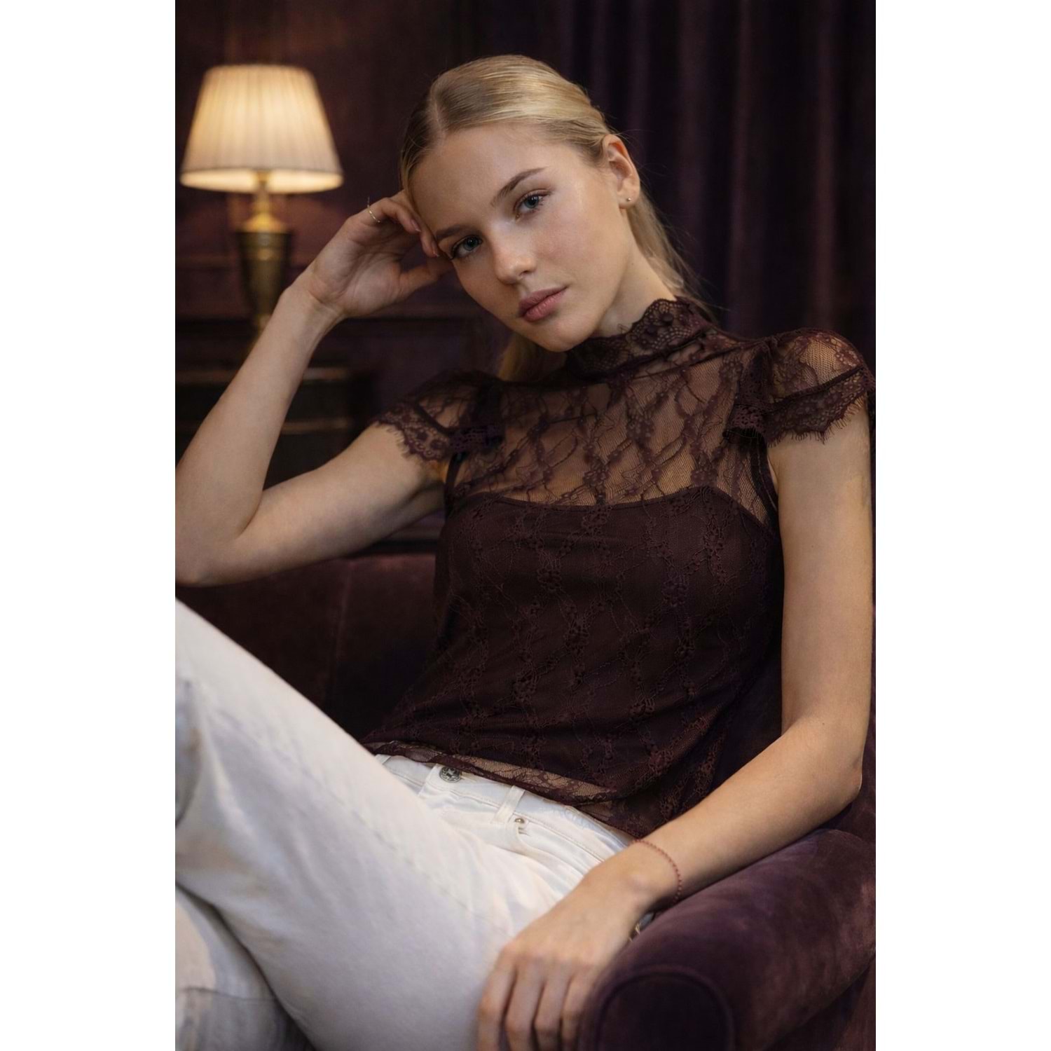 Mürdüm Dantel Transparan Bluz – Zarif Yaka Premium Tasarım - Acı Kahve - L