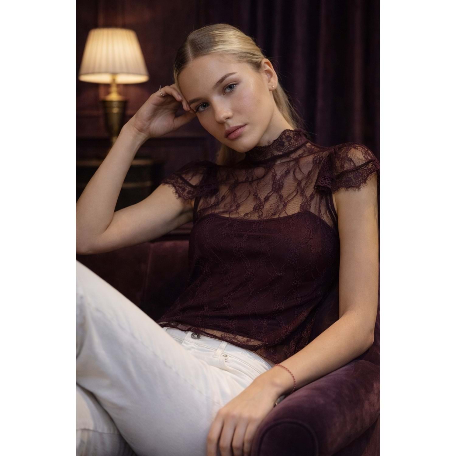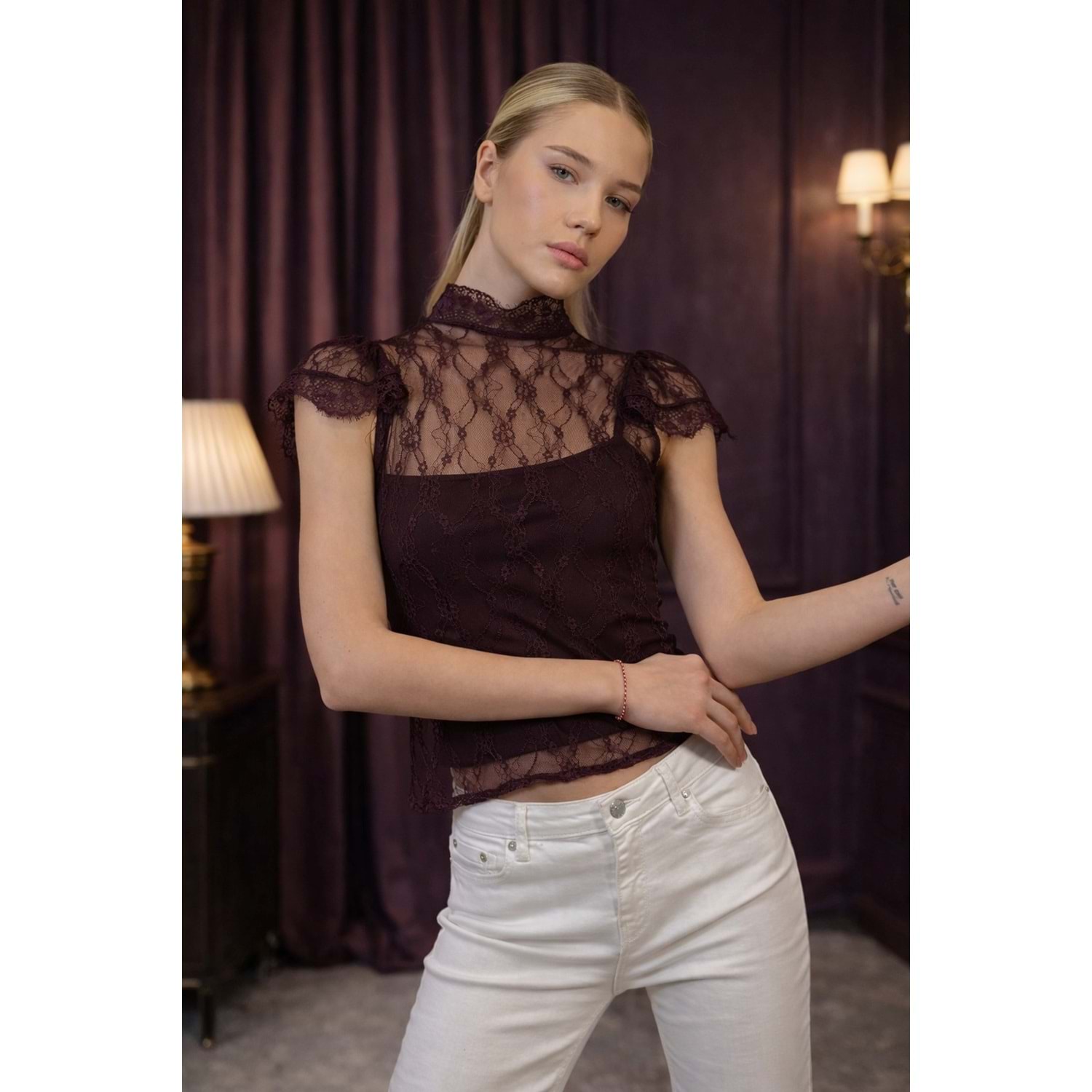Mürdüm Dantel Transparan Bluz – Zarif Yaka Premium Tasarım - Mürdüm - L