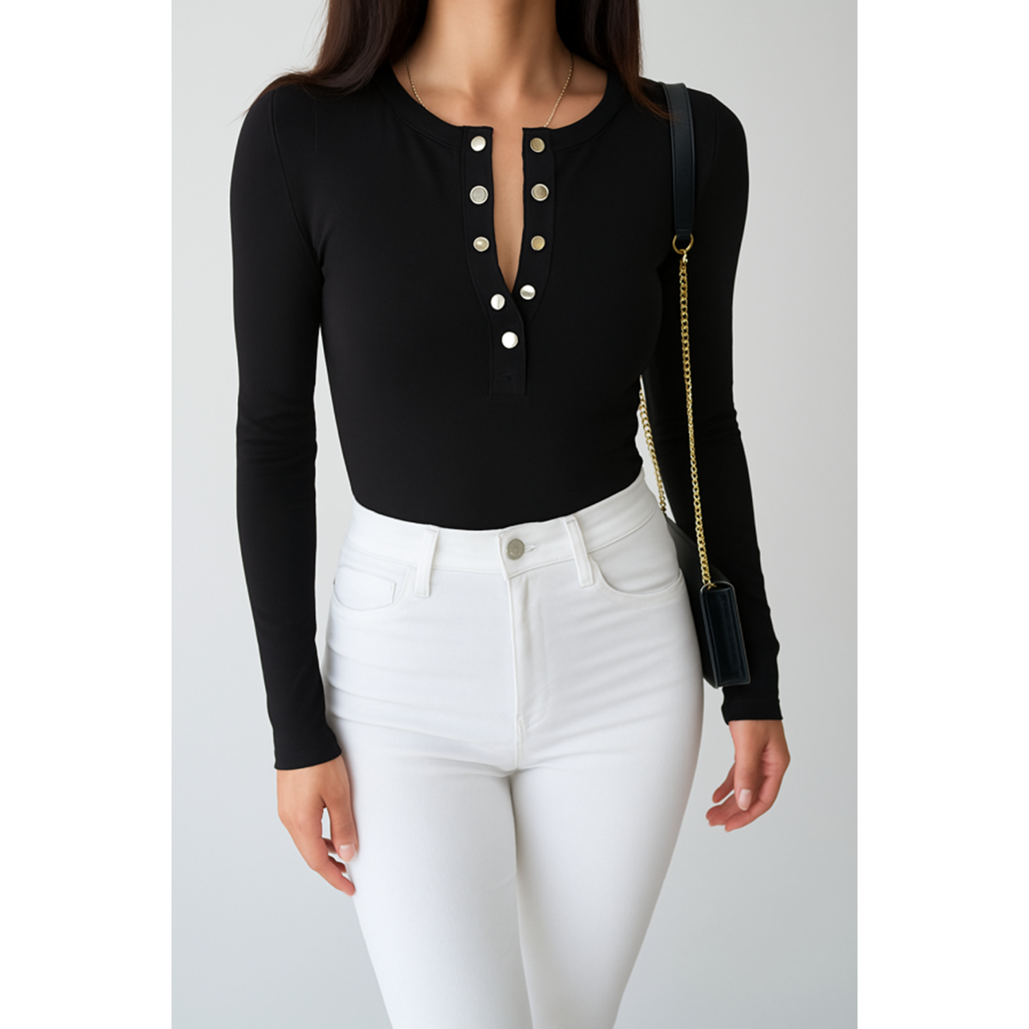 Yeni Sezon Çıtçıt Kapamalı Yaka Uzun Kol Body / Bluz Siyah Renk