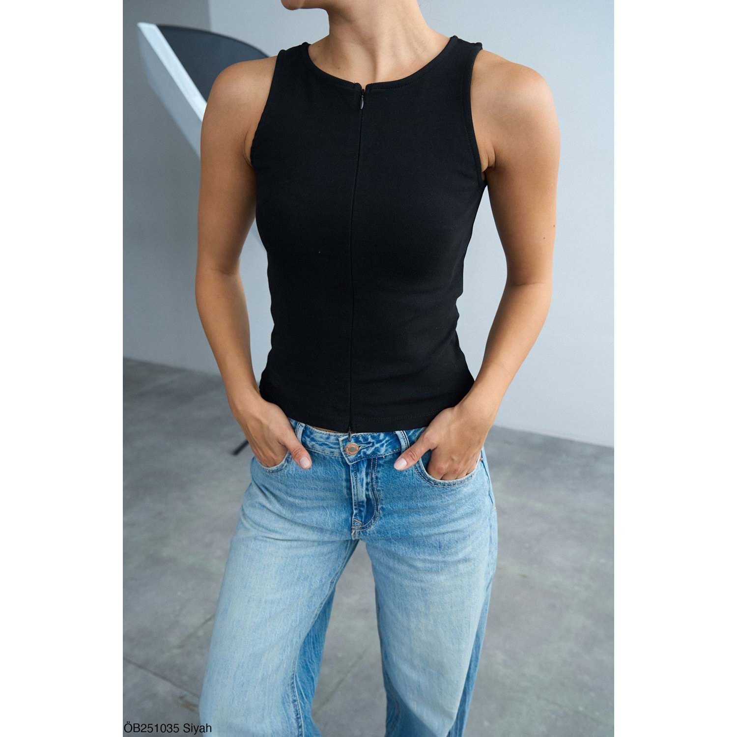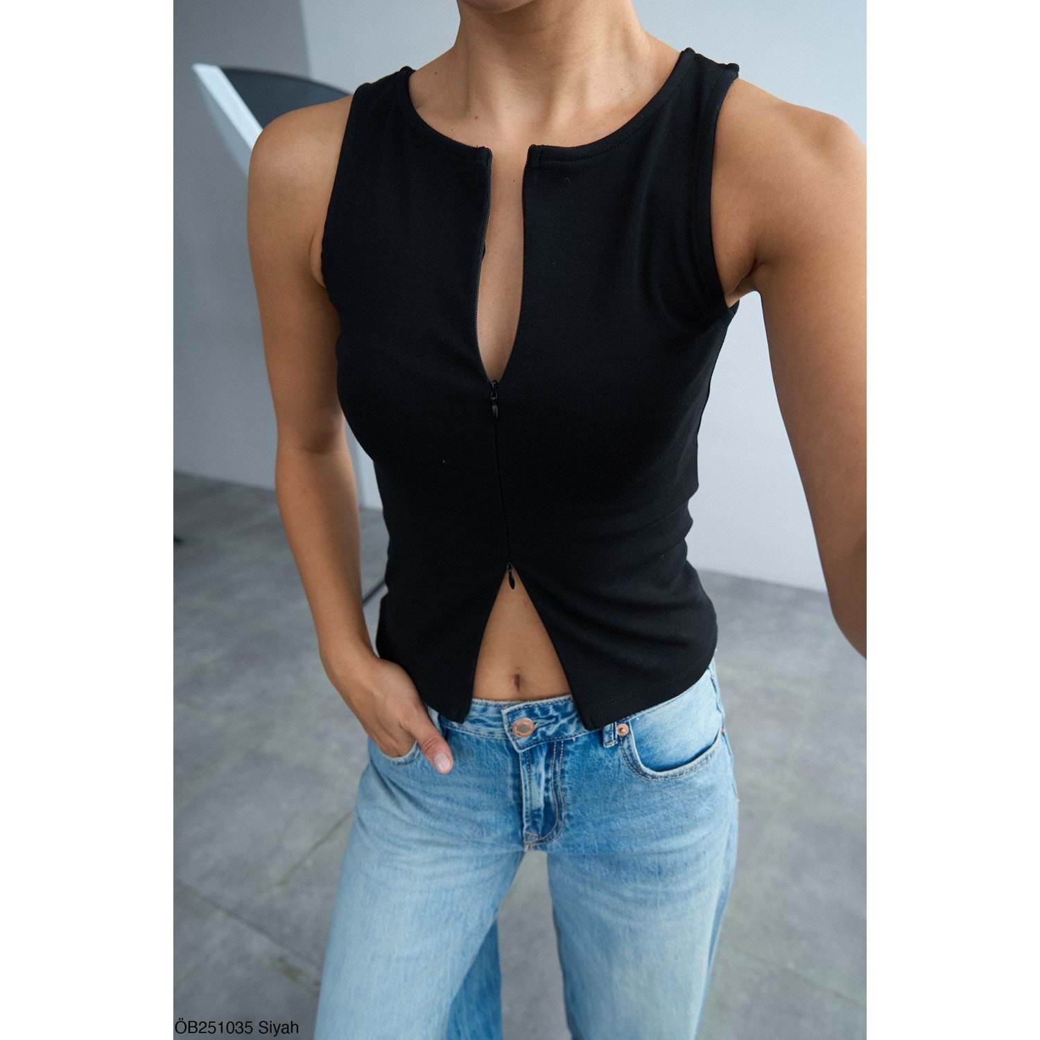 Siyah Renk Çift Yön Fermuarlı Kolsuz Tasarım Body - Bluz - SİYAH - L