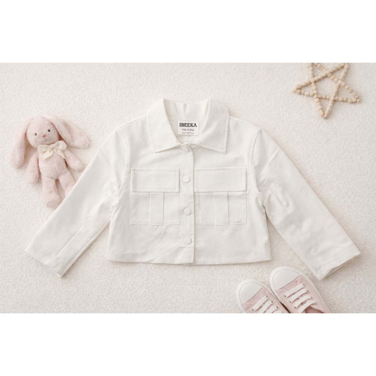 Ekru Renk Cep Detaylı Çıtçıt Kapamalı Crop Ceket Saten Astarlı - 3-4 YAŞ