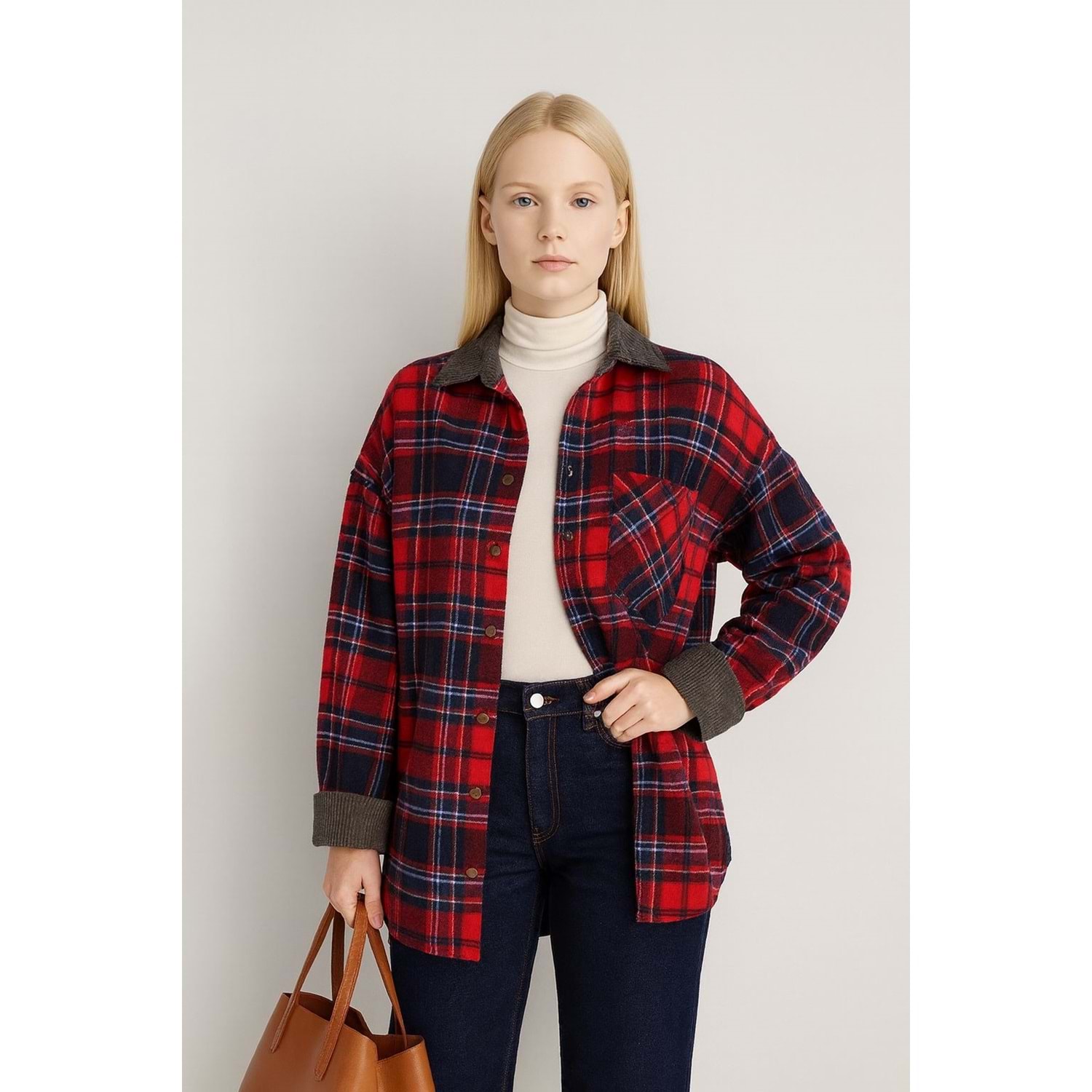 Ekose Kırmızı Renk Yaka Detay Bronz Düğmeli Oduncu Gömlek - ÇOK RENKLİ - L - ST00515-ÇOK RENKLİ-L