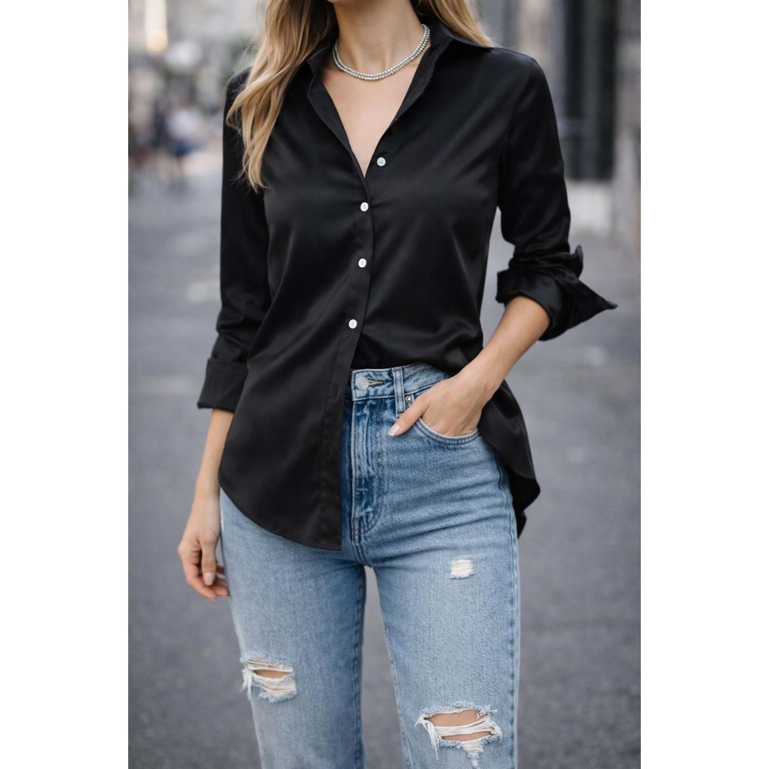 Kadın Giyim Siyah Renk Saten Gömlek - L