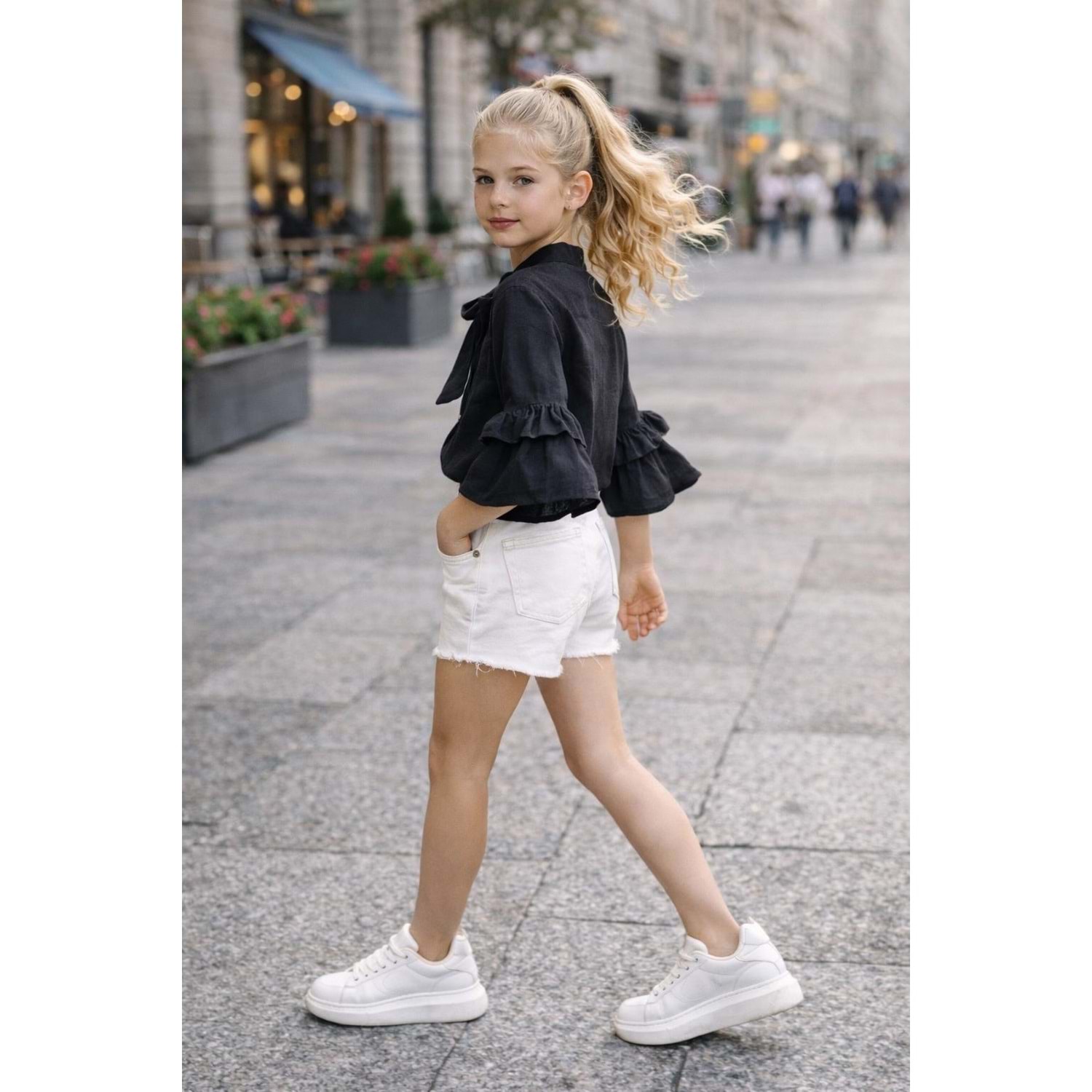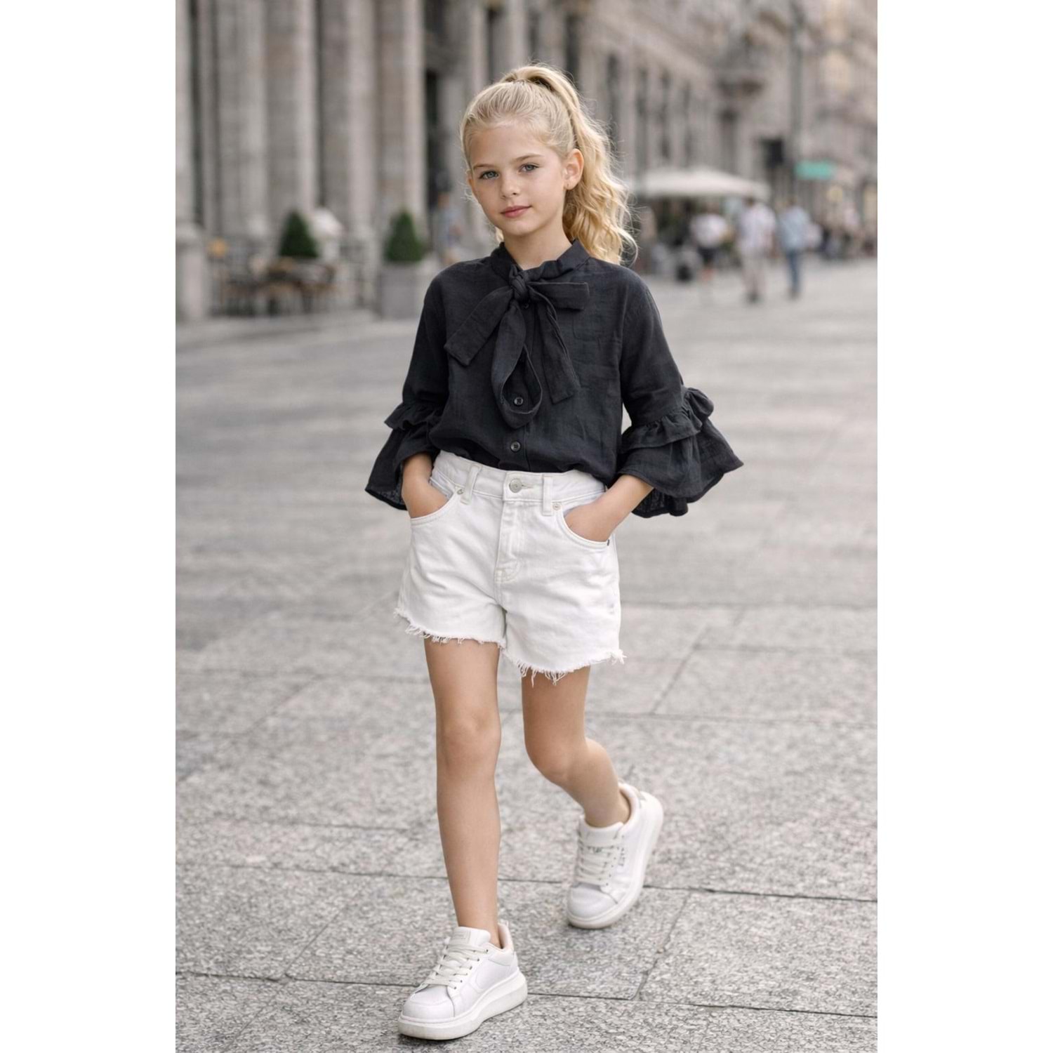 Kız Çocuk Elegant Kurdele Yaka Müslin Bluz Fırfır Kol Detaylı - SİYAH - 3-4 YAŞ