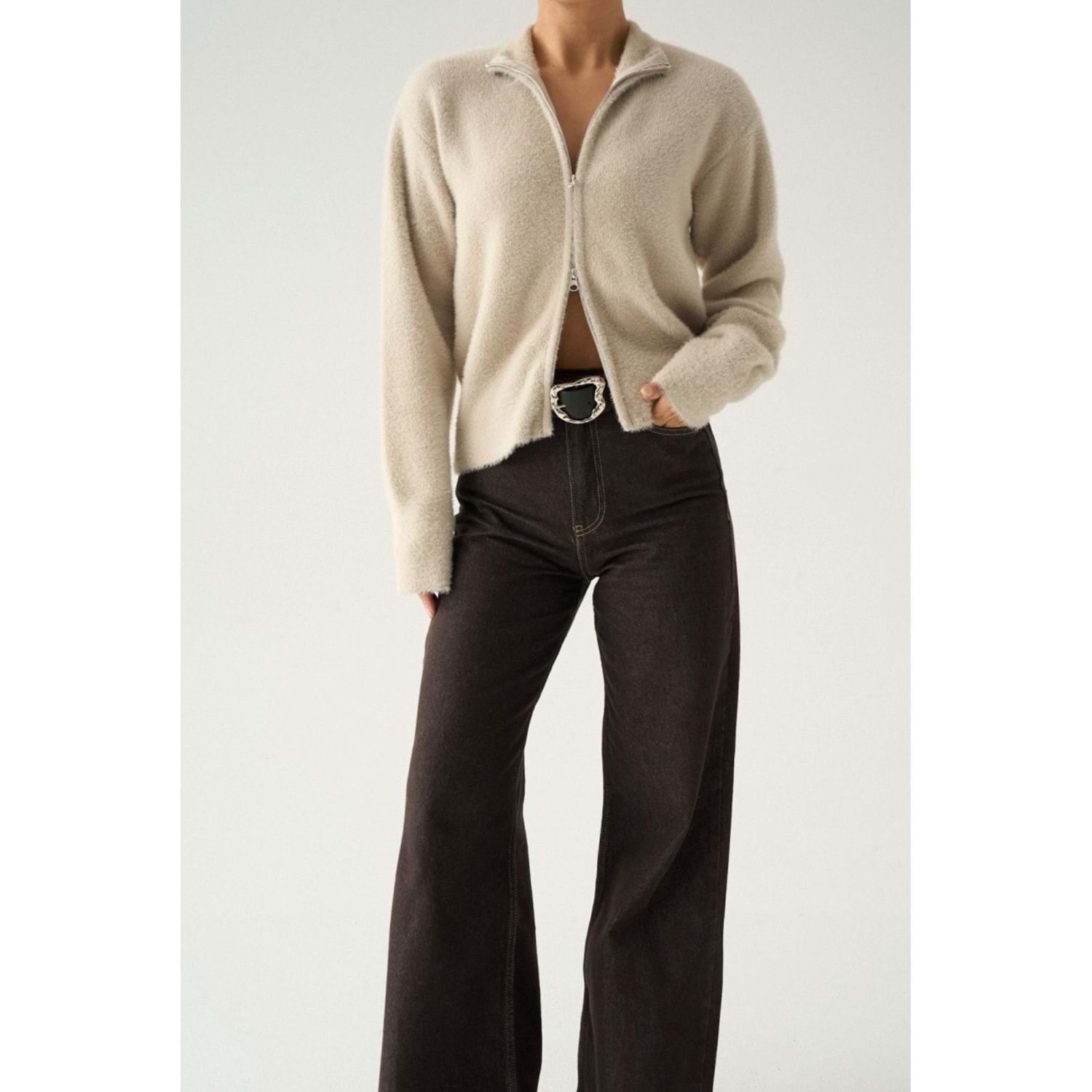 Çift Yön Fermuar Açma Detaylı Tüylü Hırka Taş Renk