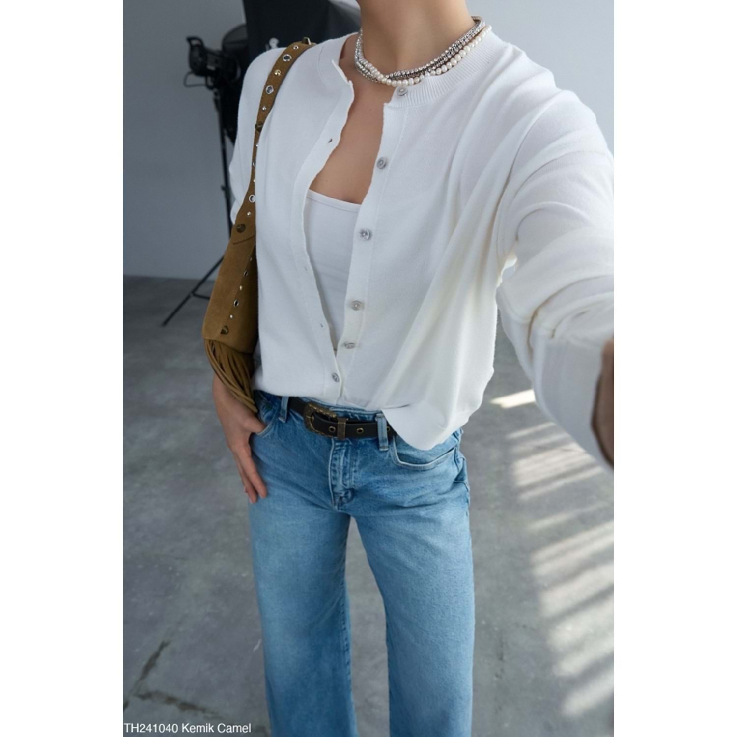 Kadın Kemik Renk Düğmeli Triko Hırka Kol Camel Renk Parça Detaylı