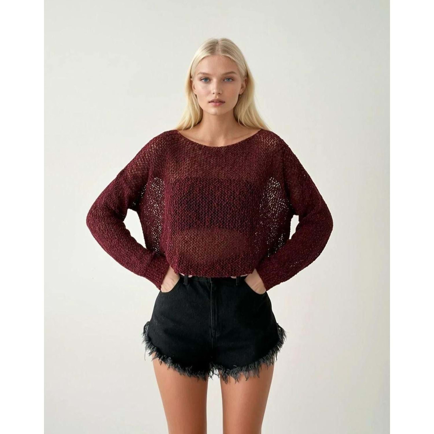 Ajur Örgü Mevsimlik Triko Kazak Düşük Omuz - BORDO
