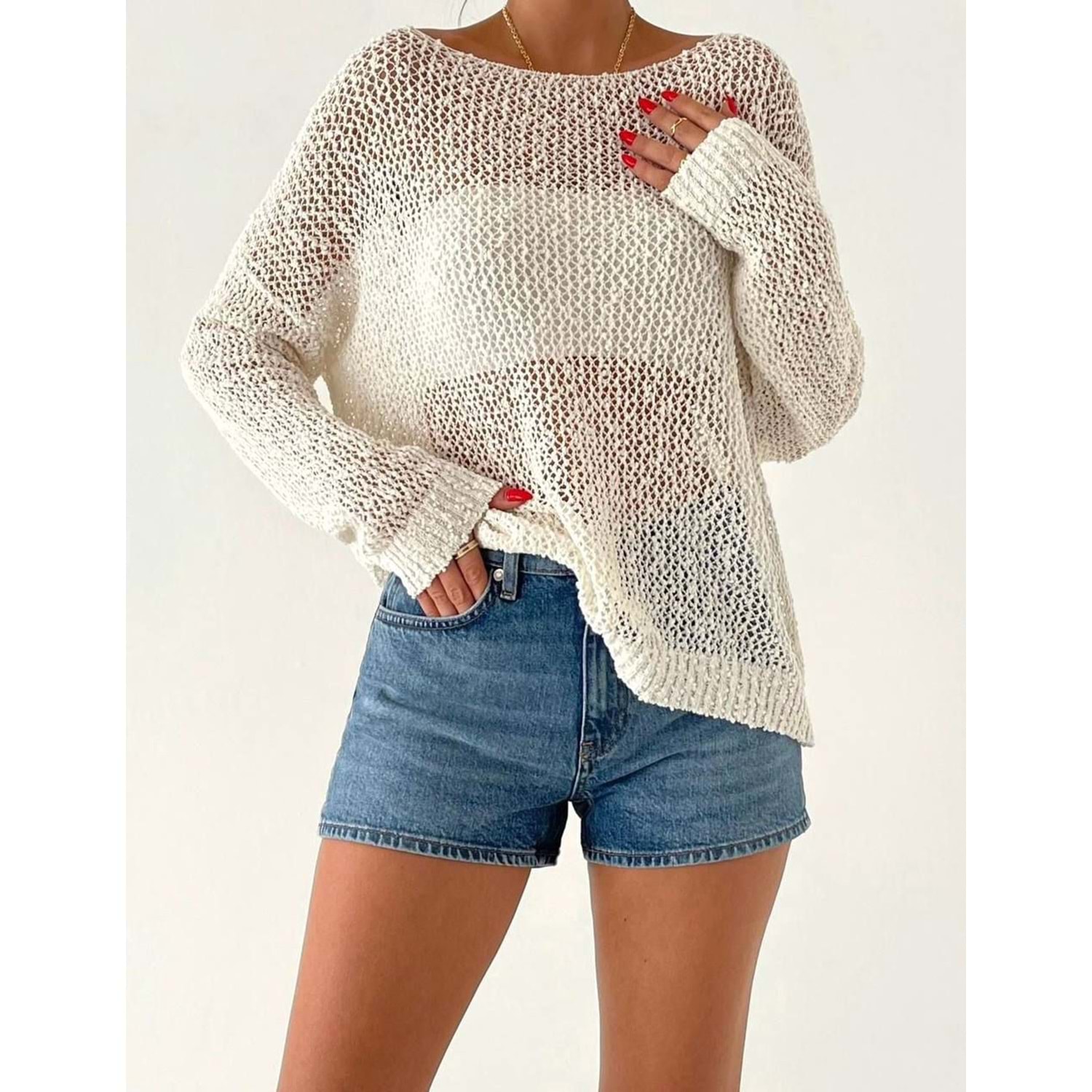 Ajur Örgü Mevsimlik Triko Kazak Düşük Omuz - EKRU