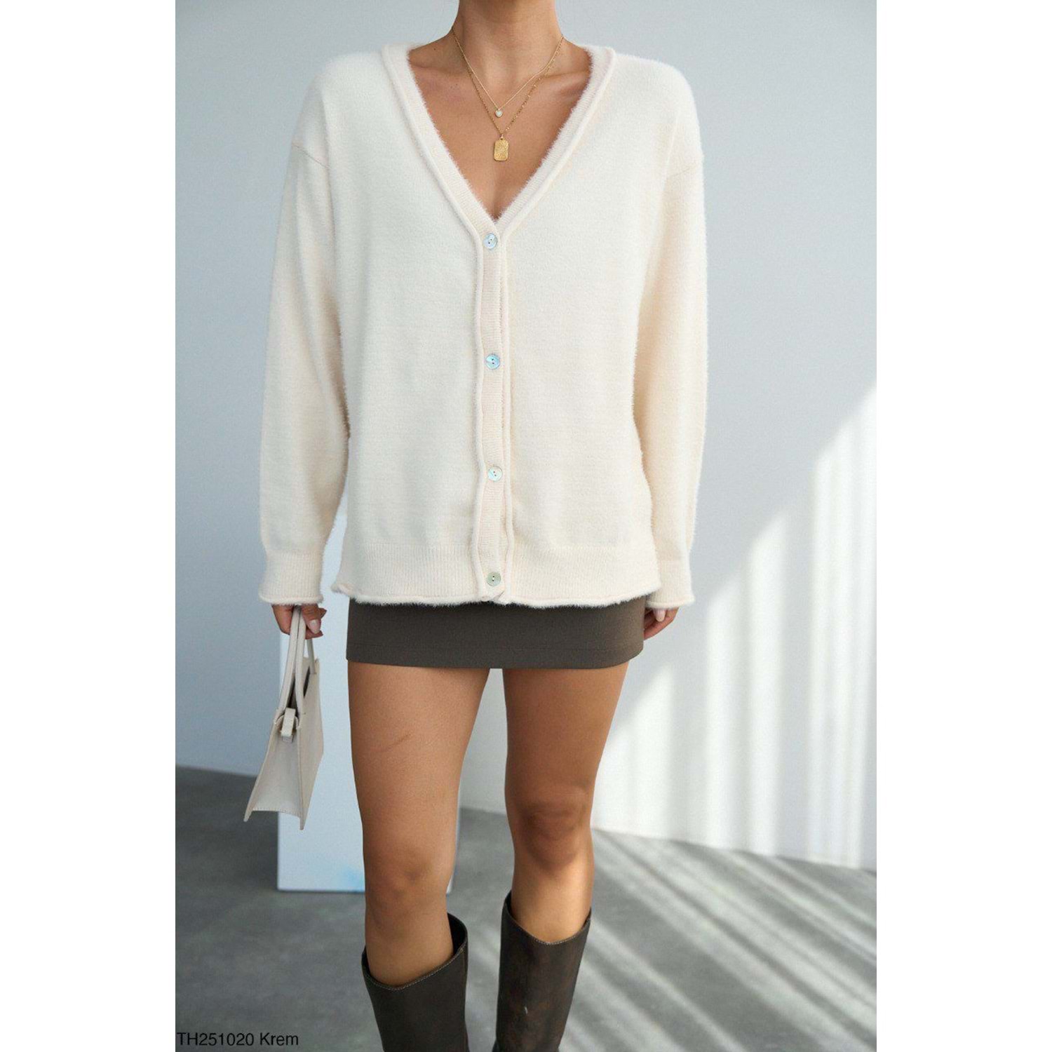 Tüylü Krem Renk 4 Düğme Kapamalı Tasarım Hırka
