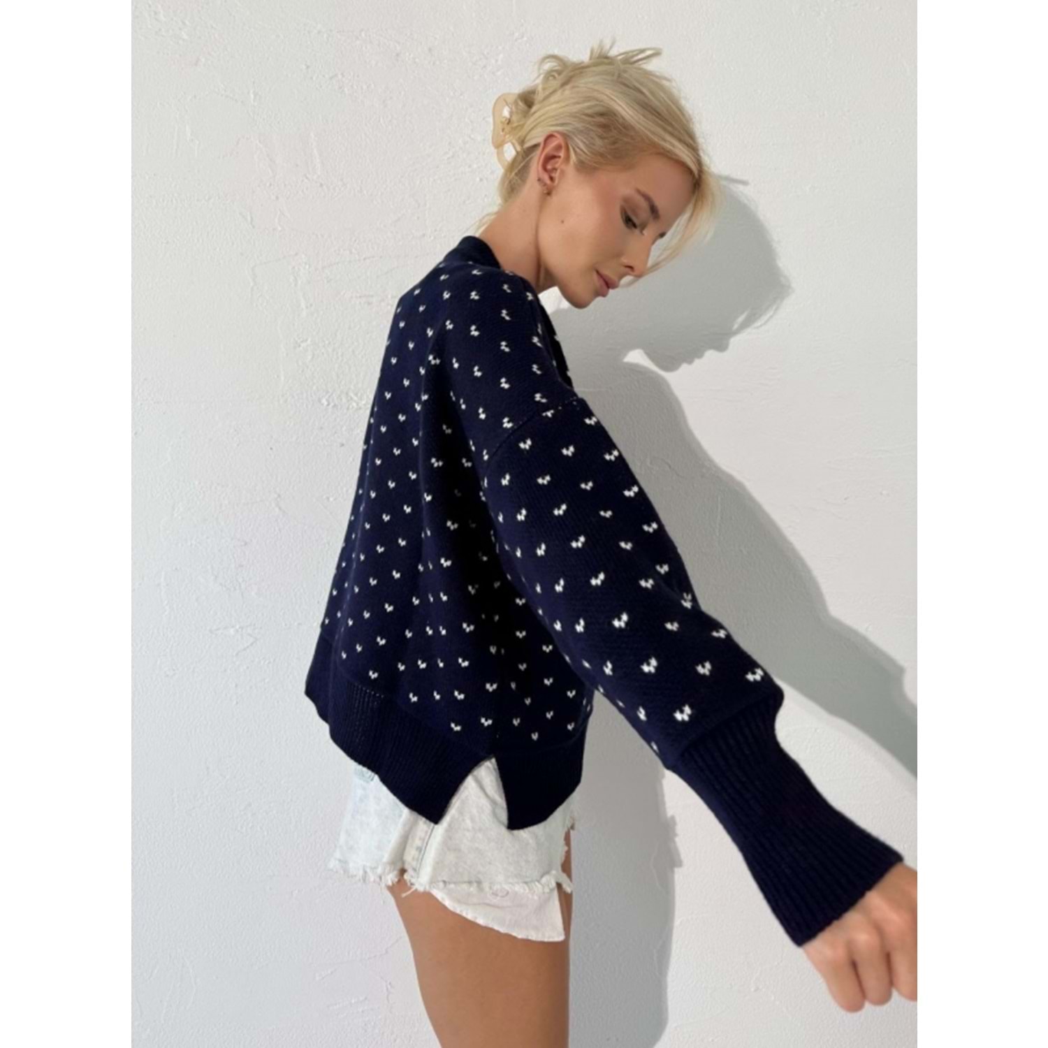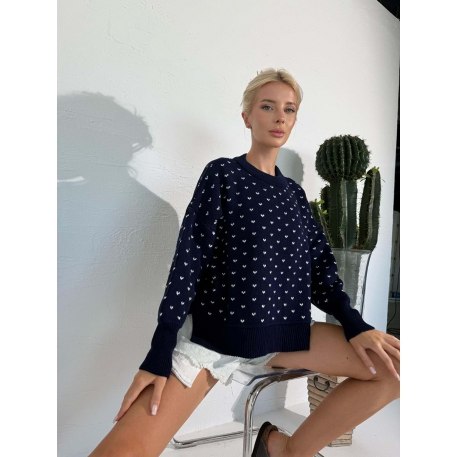 Kalp Baskı Görünümlü Lacivert Renk Kazak