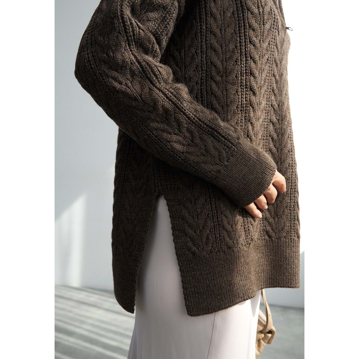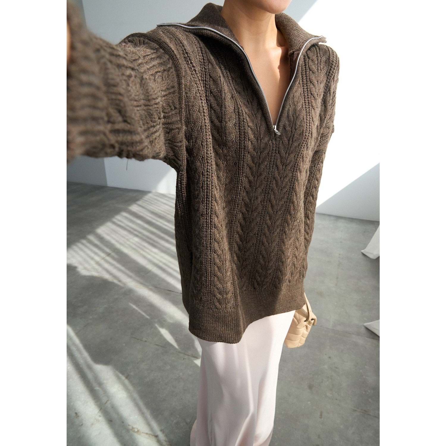 Saç Örgü Yaka Fermuarlı Kazak - Acı Kahve