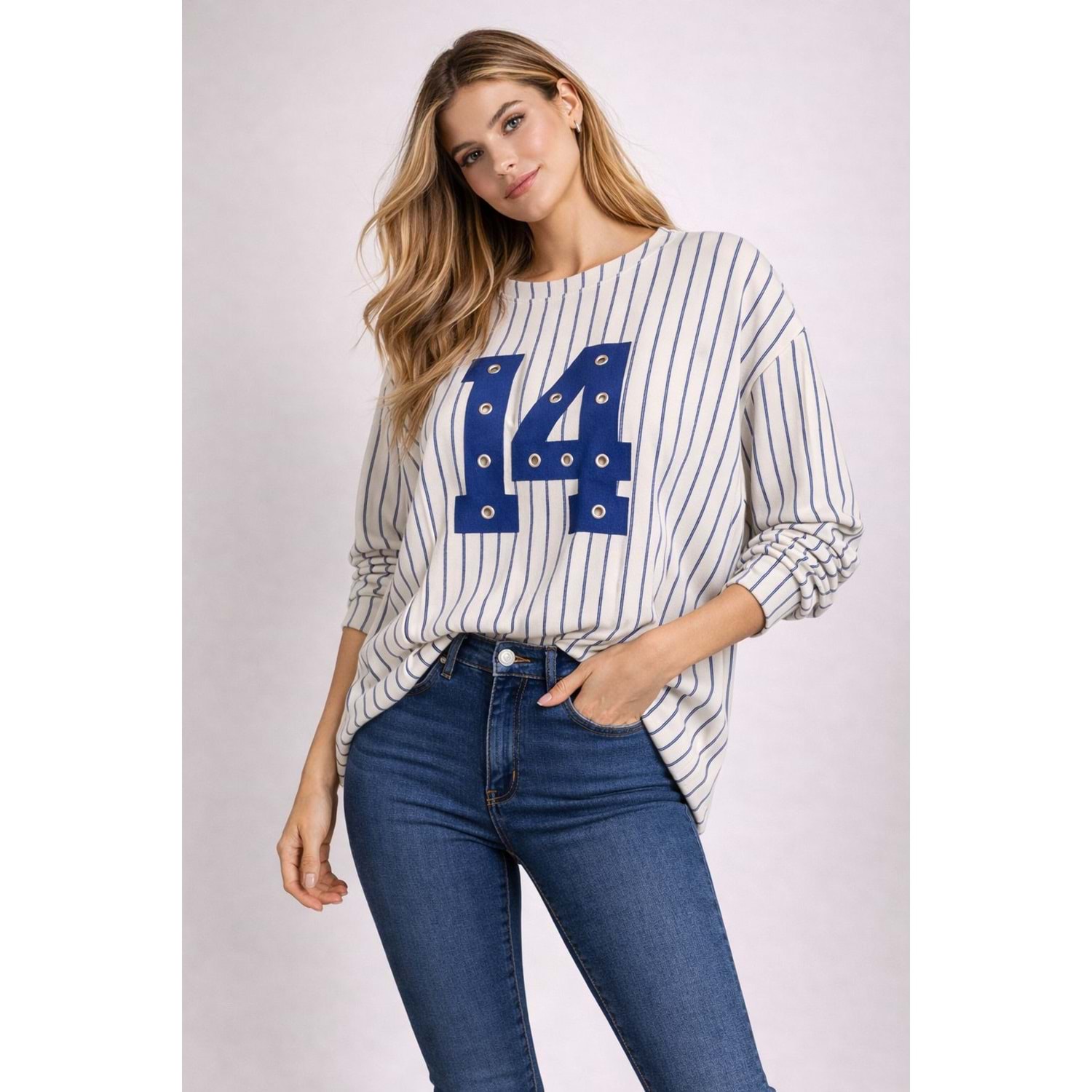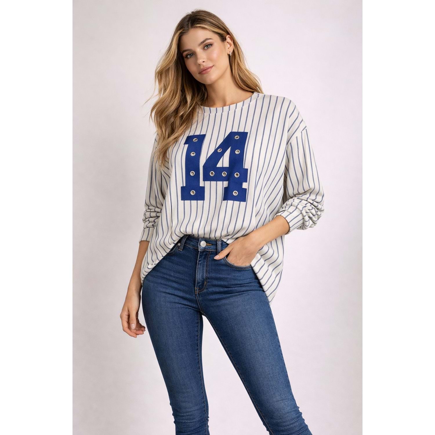 14 // Zımba Detay Yeşil Ekru Salaş Sweat - MAVİ - L