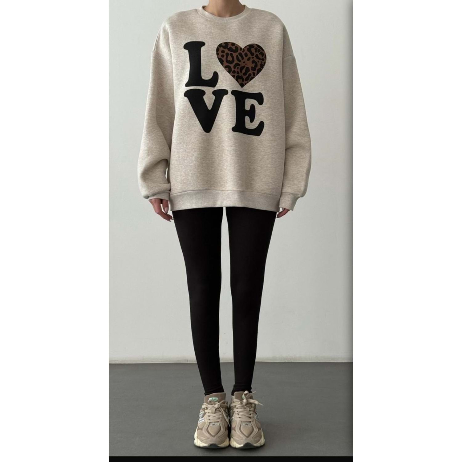 Bej Renk Love / Leopar Baskılı Sweatshirt - BEJ - L - ST00388-BEJ-L