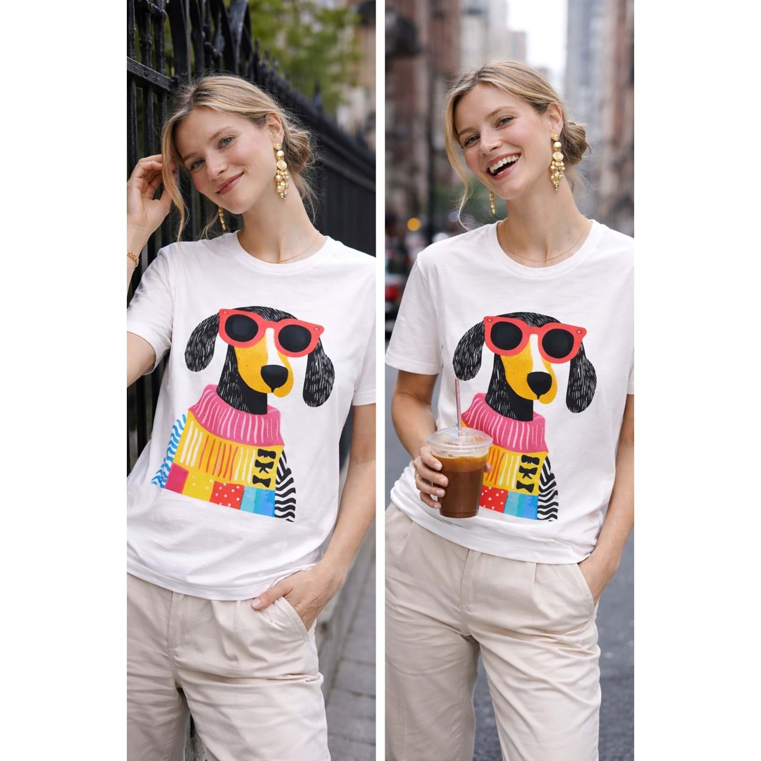 Renkli Köpek Baskılı Beyaz Kadın T-Shirt – Premium Pamuk Graphic Model - ÇOK RENKLİ - L